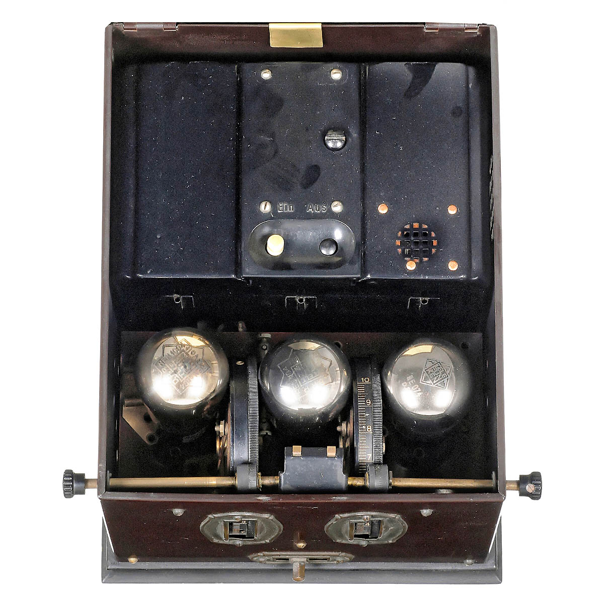 4-valve receiver, mains-operated, for external speakers, metal case with bakelite lid.