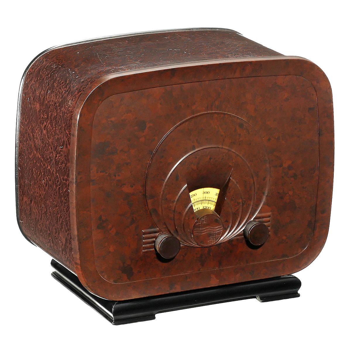 1) Radio model 824A, super inductive principle, 5 valves, LW + MW, mains-operated, bakelite case. – And: 2) Loudspeaker model 2123, magnetic system, bakelite case.
