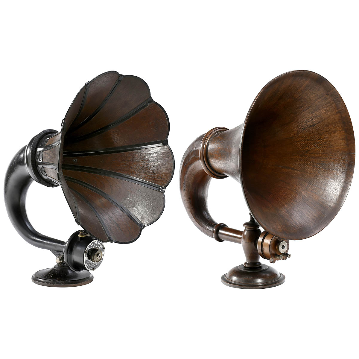 1) Amplion model Junior de Luxe AR43, 2000 ohm, 10-panel oak horn, Ø 15 in. – And: 2) Lissen, wooden base, neck and horn, Ø 13 ¾ in.