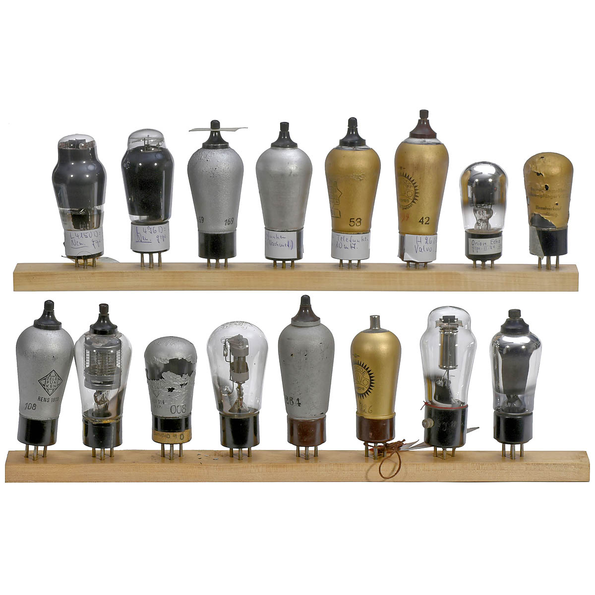 Rens 1254 (Valvo) – Rens 1234 E (Valvo) – Rens 1854 (Telefunken) – X 2918 (Valvo) – Rens 1834 (Telefunken) – X 2123 = Rens 1234 (Valvo) – ACH 1 (Valvo) – Rens 1254 (Telefunken – BCH 1 (Telefunken) – Rens 1224 (Telefunken) – AN 2718 = Ren 1826 (Valvo) – CO 122 – H 4080 = Ren 1204 (Valvo) – Rens 1264 (Valvo) – Res 964 (Telefunken) – Ren 914 (Telefunken) – Rens 1294 (Telefunken) – Rens 1818 (Telefunken) – Re 114 (Telefunken) – Rens 1204 (Telefunken) – Ren 704 d (Telefunken) – Ren 904 (Telefunken) – Ren 1826 (Tele-funken) – AG 495 = Ren 904 (Tekade) – Ren 1821 (Te-lefunken) – Ren 1104 (Telefunken) – Ren 1004 = Ren 914 (Telefunken) – T 34 (Radio Record) – Re 604 (Tele-funken) – Res 044 = Res 094 (Telefunken) – Res 094 (Telefunken "Deutsche Lufthansa") – Re 304 = Re 114 – Re 034 (Telefunken) – Re 074 (Telefunken) – AS 4100 = Rens 1204 (Tungsram) – Res 664 (Telefunken) – E 424 = Ren 904 (Philips) – L 427 d = Res 374 (Valvo) – A 2118 = Ren 1821 (Valvo) – Rens 1374 (Telefunken) – Rens 1374 (Telefunken) – H 4148 D = Ren 1284 (Valvo) – Rens 1823 d (Telefunken) – NVSS 18 (Sator) – W 4100 = Ren 914 (Valvo) – PB 4 = Res 174 d (Tri-otron) – Res 164 (Telefunken) – A 4110 = Ren 904 (Valvo) – Rens 1820 (Telefunken) – E 43 = Res 964 d (Sator) – L 4150 d = Rens 1374 (Valvo) – L 496 D = Res 964 (Valvo) – Rens 1819 (Telefunken) – Rens 1214 (Telefunken) – Rens 1284 (Telefunken) – H 2618 D = Rens 1894 (Valvo) – A 4 = 074 (Orion Echo) – A 441 = Re 074 d (Philips). On maple baseboards. All filaments tested.