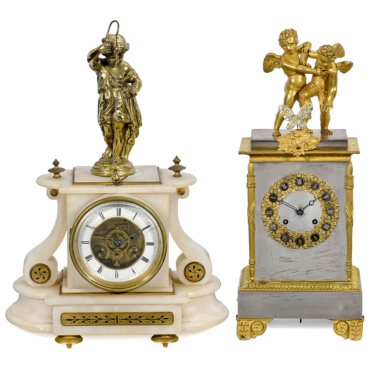 1) Brass case, silvered and fire-gilded, 2 fire-gilded bronze angels, brass movement, signed M. JI58, with pendulum synchronously moving butterfly, overall height 15 2/5 in. – And: 2) Soapstone case, bronzed cast-metal figure, brass movement, signed Deposé Française, overall height 14 ½ in. – Both clocks in good condition, in need of adjustment.
