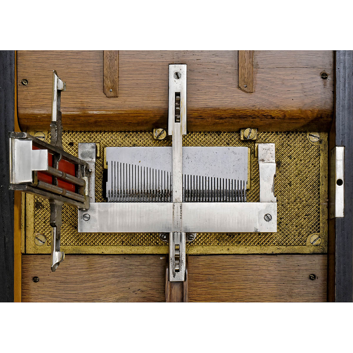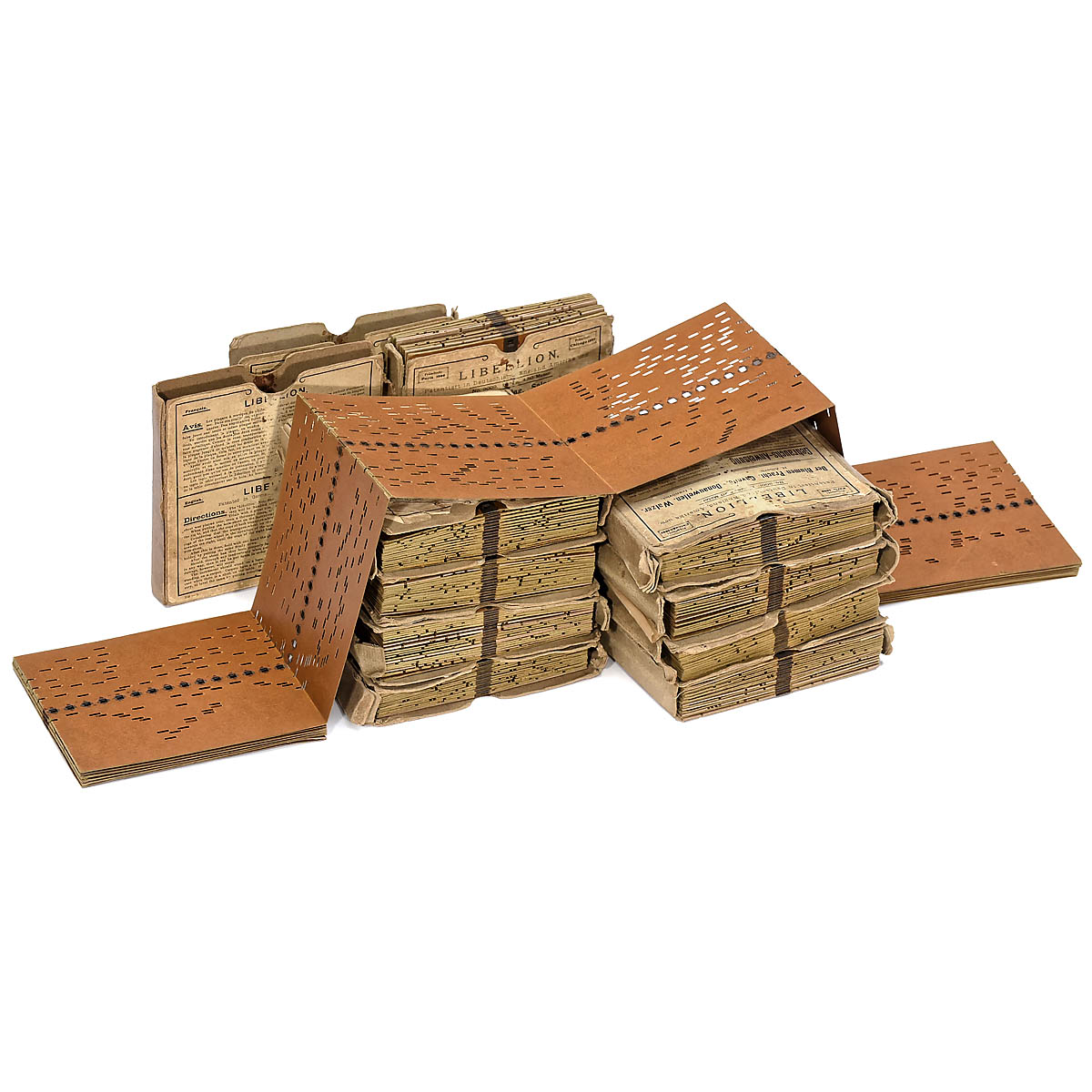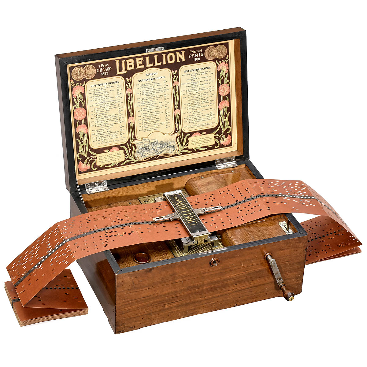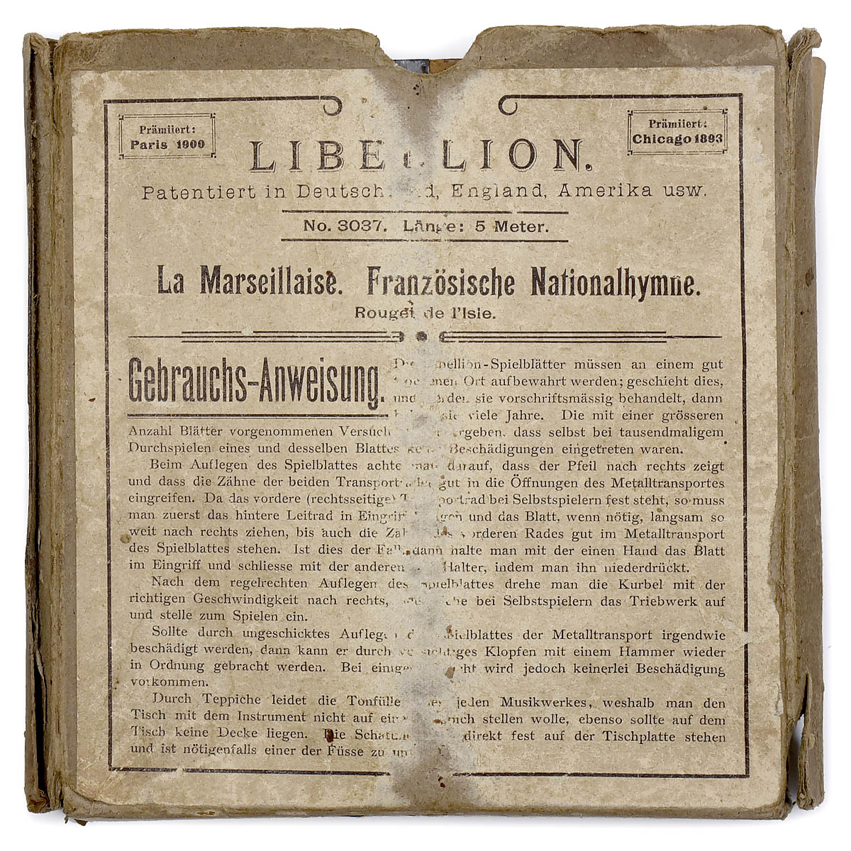 Manufactured by Leipziger Musikwerke Libellion Schützhold & Werner, for 5 ½ in. zig-zag folded note books, with 42 notes in steel comb (complete!), wooden case, size 17 1/3 x 12 ¼ x 9 7/8 in. In contrast to disc musical boxes, this instrument can reproduce the largest pieces of music in full. Produced only for a short time, it is consequently very rare. Playing condition. With 11 cardboard books. – Very good condition.