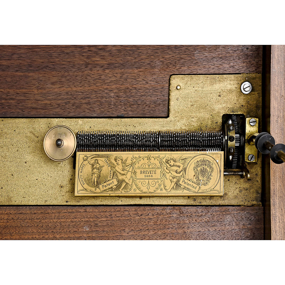 For 15 3/4-inch discs. Manufactured by Polyphon Musikwerke, Leipzig. 77 teeth in comb (complete), walnut case with original lithograph in lid, original condition. With 10 discs. Playing, but needs restoration.