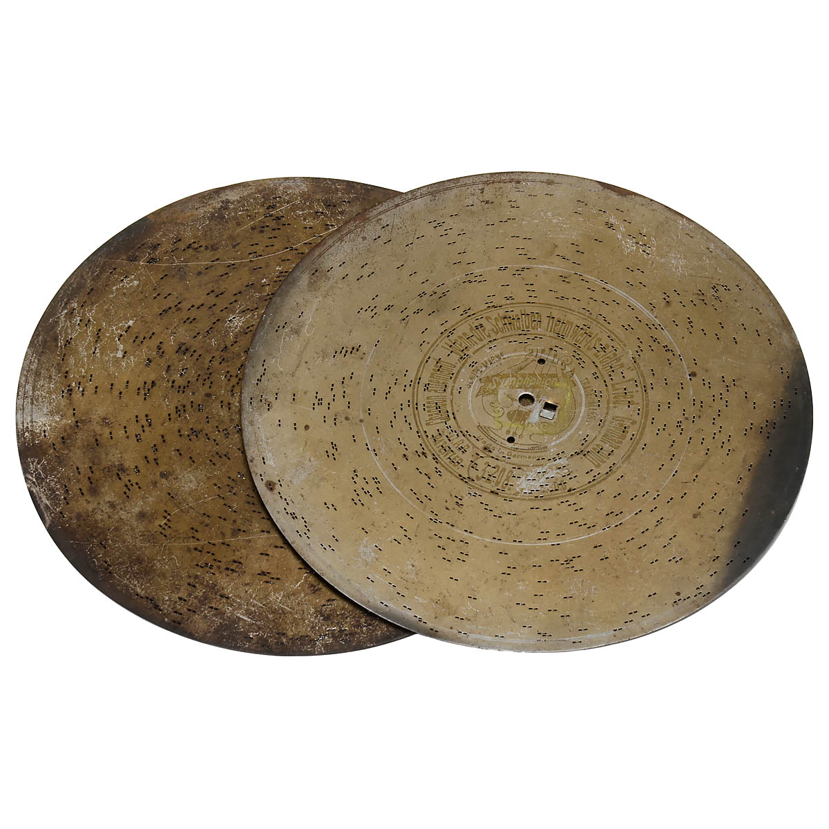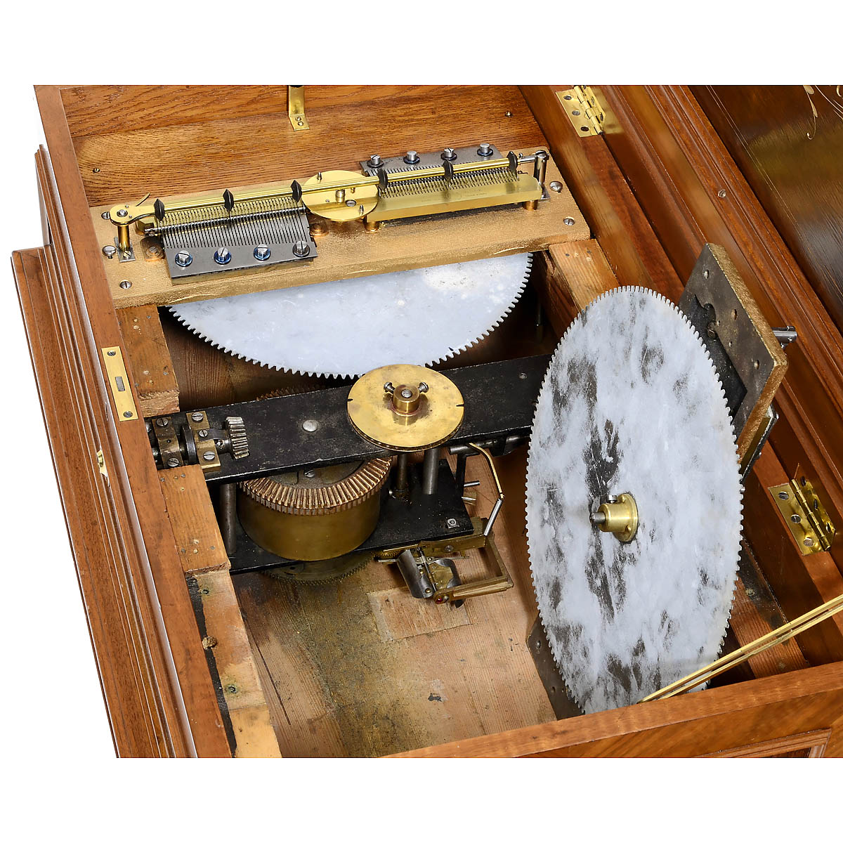 Symphonion Musikwerke, Leipzig. With twin discs playing side by side, Ø 11 ¾ in., 2 sets of combs with 42 teeth each (complete), walnut case with rosewood panels, floral marquetry inlaid lid, gilt "Symphonion" name incised on inner lid, front with crank, width 32 in., excellent restored condition. With full and expressive sound. With 2 sets of discs: 3208 "Wenn die Schwalben heimwärts ziehn" and 3518 "Chimes of the Deep".
