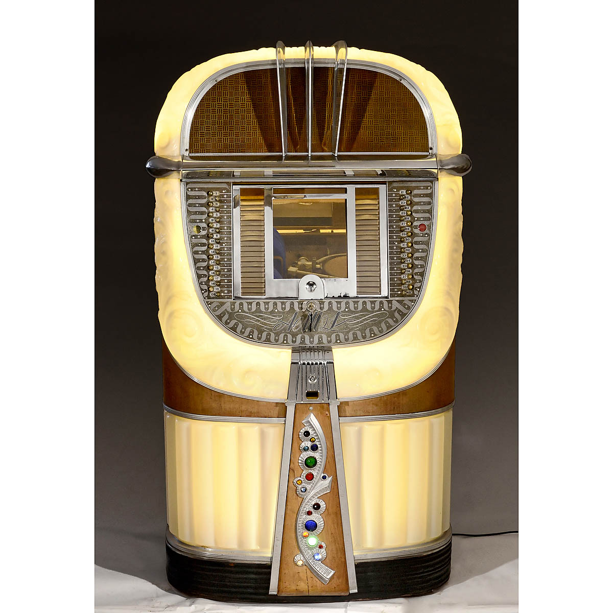 Model A, 40 selections, changed from 78 rpm to 45 rpm, 230 volt, mono-amplifier, central turntable viewing window, illuminated acrylic panels, height 69 in., complete. One acrylic panel with crack, illumination with LED bulbs, jukebox not working.