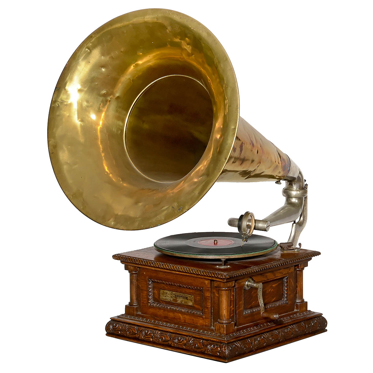 Gramophone & Typewriter Ltd., London. Carved oak case with gilt transfer at the front, "Exhibition" soundbox and brass horn, length 26 3/4 in., Ø 16 ½ in., good working condition, with one disc.