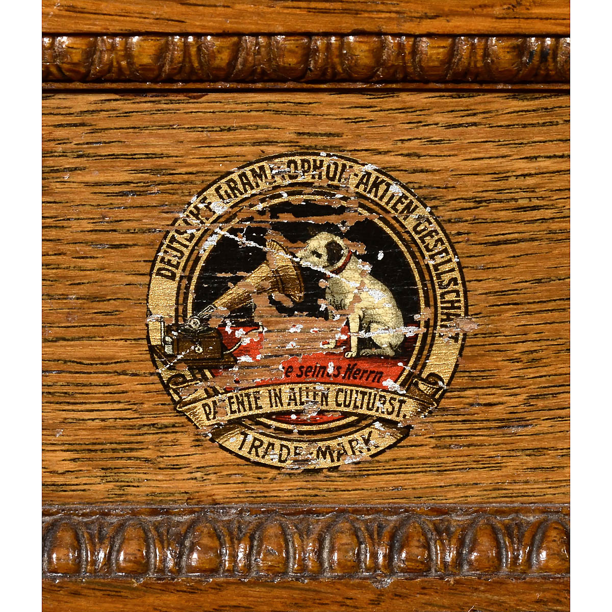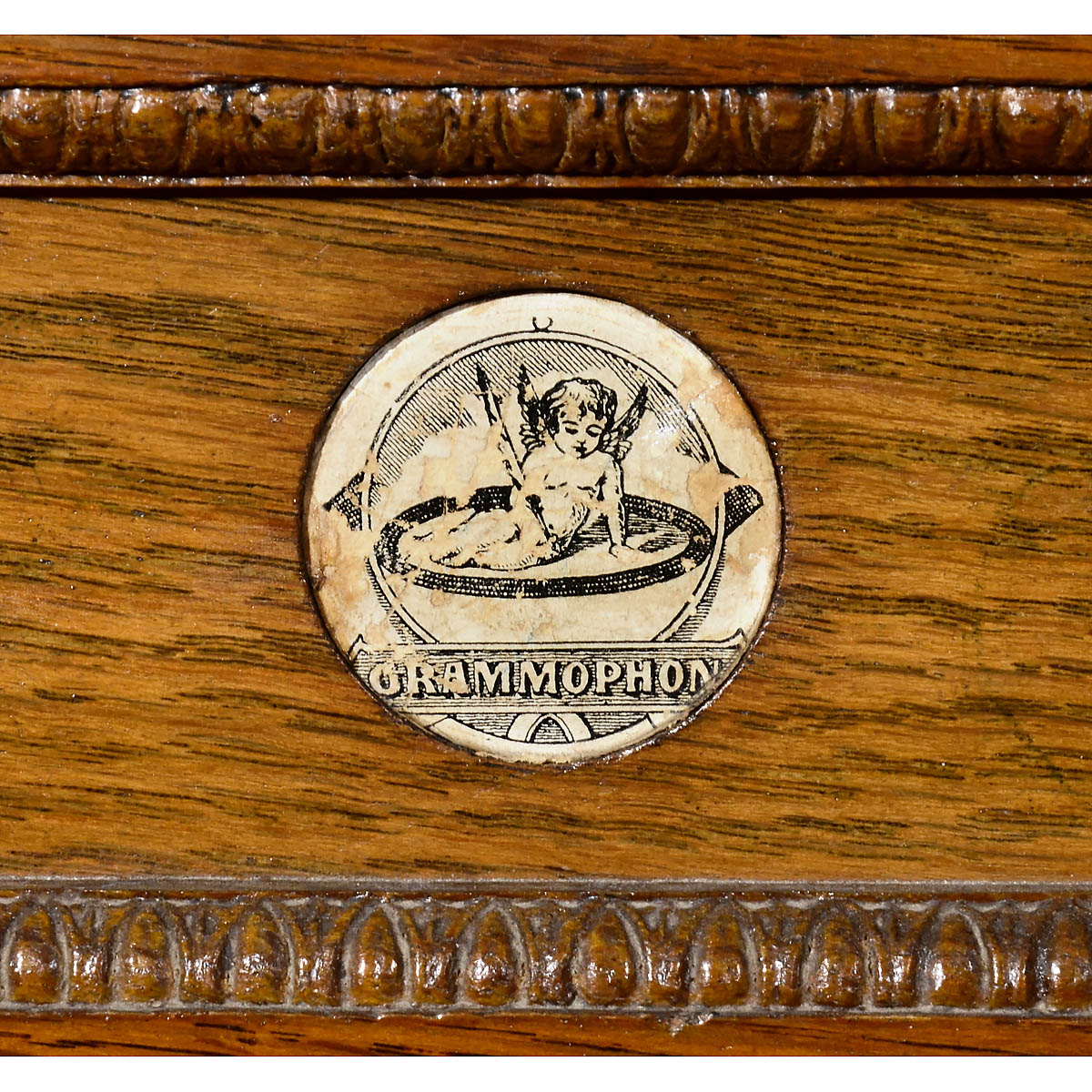 Deutsche Grammophon Aktien Gesellschaft. No. 5415, underside with embossed "writing angel", Exhibition soundbox, carved oak case, double-spring motor, large brass horn Ø 20 ½ in., working, speed regulator needs adjustment.