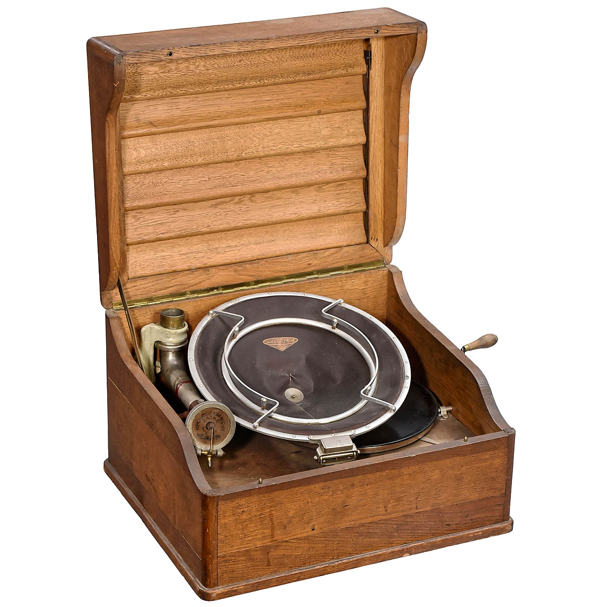 For vertically-cut discs, with additional pick-up arm for horn loudspeakers, lid with adjustable blades for the volume control, working, with 21 Pathé discs.