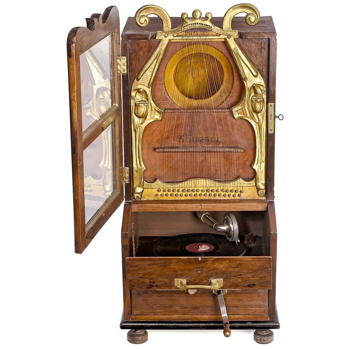 By Krebs & Klenk, Hanau. Mahogany-stained wood case, string-covered iron frame in front of the horn, glazed door, crank to the front, original Klingsor soundbox, good playing condition.
