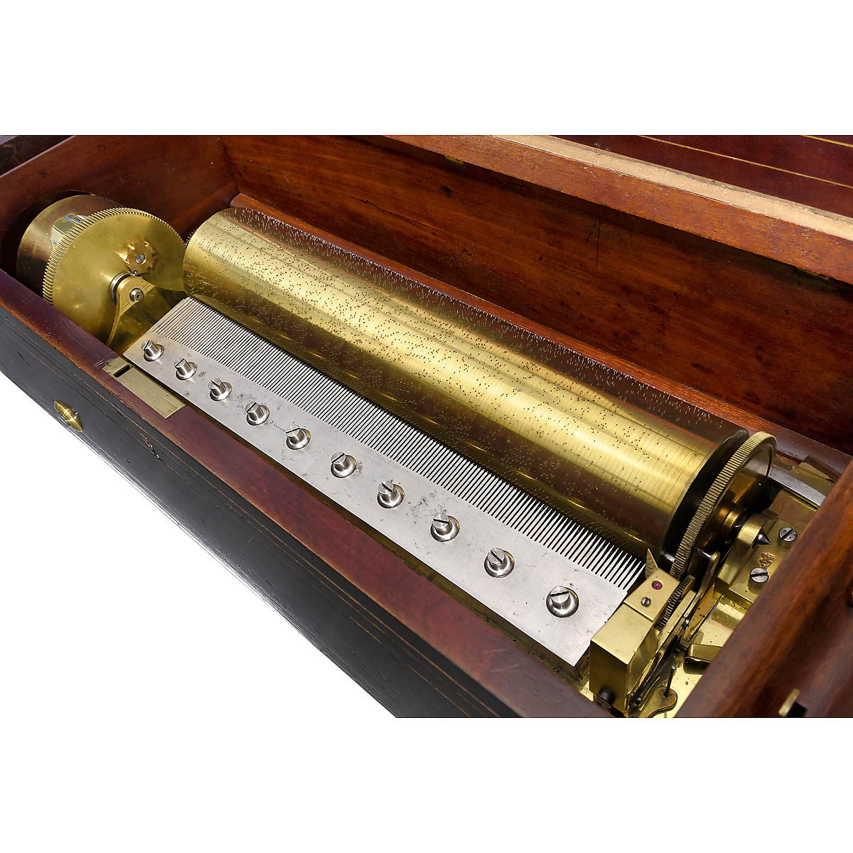 No. 1106, playing the overtures to "Zampa", "Tann-hauser", "Freyschutz" and "Guillaume Tell" in one revolution each and "Herculanum Grande Valse" and "Il Bacio Valse Brilliante" in two half-turns of the fifth revolution, with comb of 153 hand-cut teeth with square tips (complete), stamped "D. Lecoultre", brass bedplate, massive lever-wind spring motor, instant-stop, tune-sheet titled "Quartre Ouvertures & Deux Valses", ebonised case with red interior and matching veneered lid with boxwood stringing, inlaid musical trophies in the corners and marquetry motif of dancers and a piper surrounded by flowers and foliage in the centre, 26 in. (66 cm) wide, cylinder 14 5/8 in. (37 cm) x 3 3/8 in. (8.5 cm) diameter, four treble teeth and two bass tips nicely replaced. – The movement is in excellent restored condition, with a full tone and fine arrangements that play for just over two minutes on a complete revolution.