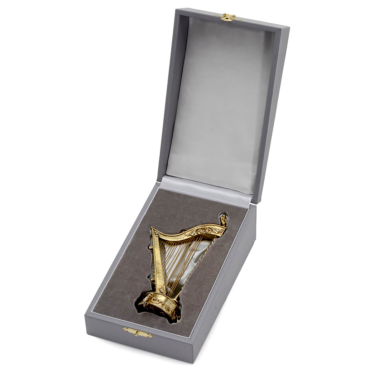 With single-air miniature Reuge cylinder musical movement activated by disguised flower stop/start button on the underside, in gilt 18-string harp-form case with engraved sides, three mounted amethysts, relief of scrolls and flowers and a classical maiden figure on the capital, ht. 8 in. (20 cm). The harp is housed in modern custom-made fitted leather-covered traveling case. – An exquisitely decorated musical objet de vertu.