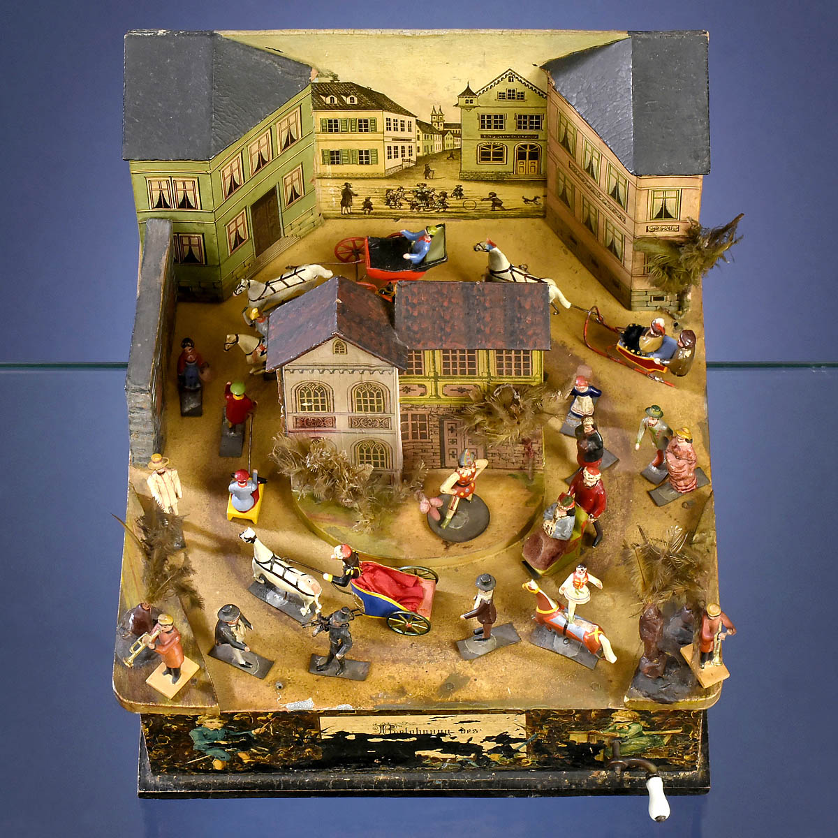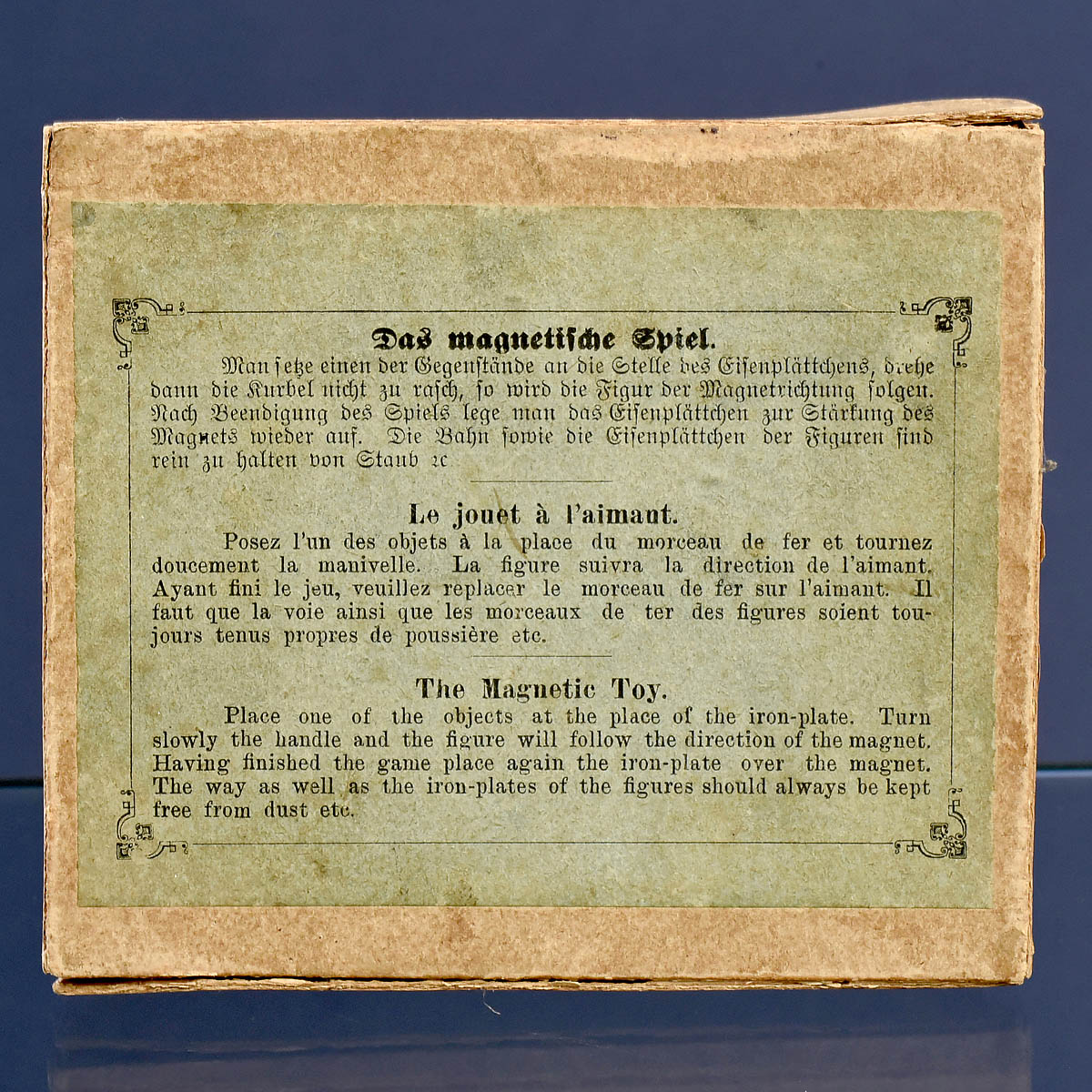 The Magnetic Toy, possibly by Zimmer & Söhne, Shalkau, Thuringia. Village scene with lithographed paper-covered houses, trees with feather foliage, hand-turned musical movement and painted metal plate with moving magnet beneath, base 8 ¼ x 8 ½ in. (21 x 22 cm). – With twenty carved and painted wood figures, including horses, a pulling buggy, chariot and a sled, trumpeters, chimney sweep, clown, dancer on a horse, soldier and pedestrians, in 3 original card boxes with instruction labels in German, French and English: "Place one of the objects at the place of the iron-plate. Turn slowly the handle and the figure will follow the direction of the magnet. Having finished the game, place again the iron-plate over the magnet. The way as well as the iron-plates of the figures should always be kept free of dust etc." – Good original condition, bright colors, figures with minor losses, musical movement functions well, magnetic function inactive.
