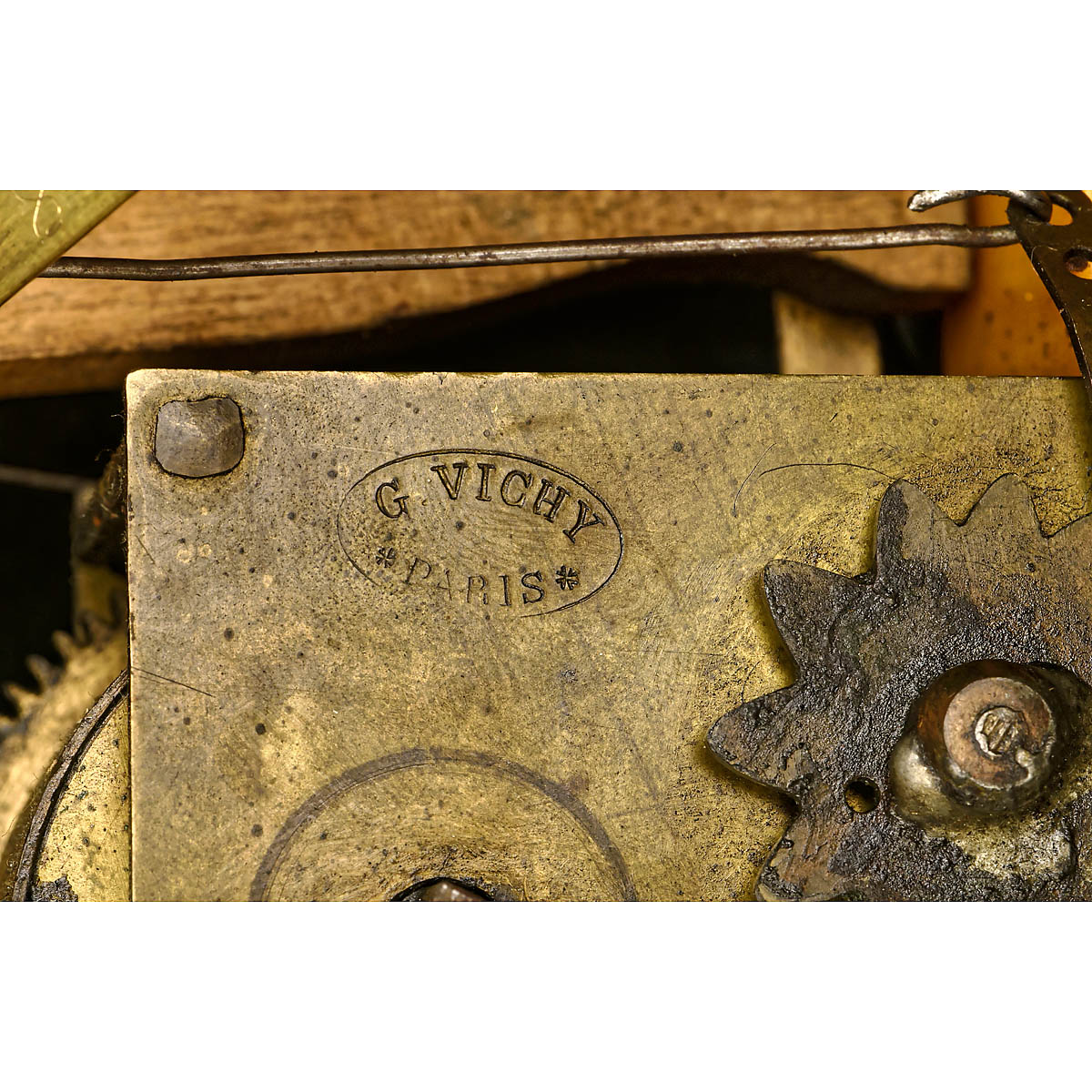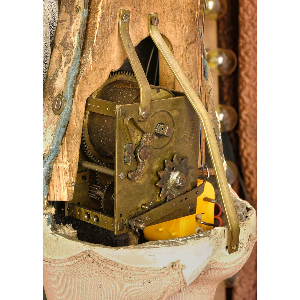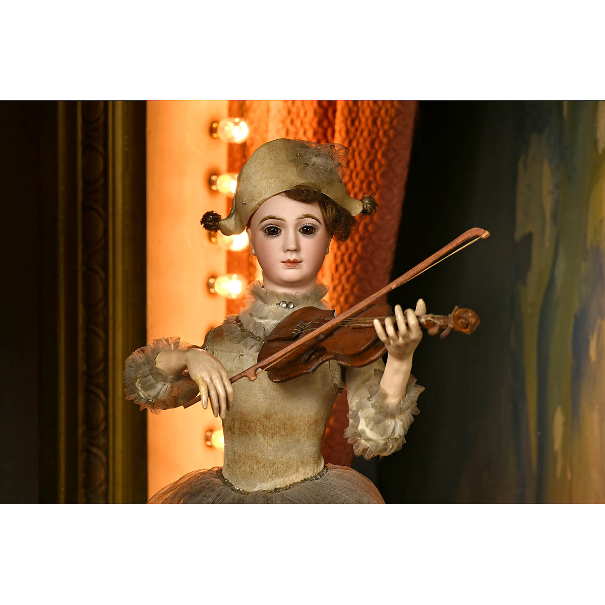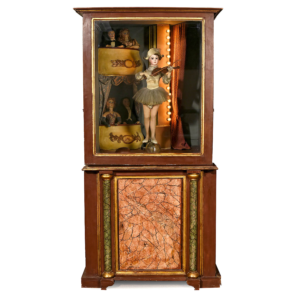 Depicting a pierrette equilibrist balancing on a glass ball with painted star motifs, in theater setting with curtain, stage and foot-lights and two boxes with an audience of Dean's cloth dolls. With fine Jumeau bisque portrait head (with artist mark "HVII") modeled as an adult woman with heart-shaped face, serene gaze, fixed brown paperweight eyes with lightly-shaded lids, aquiline nose, closed mouth and defined philtrum. She wears a cream satin outfit with gauze tutu, bicorn hat decorated with sequins and original brown mohair wig over cork pate. – Her shapely papier-mâché body, with defined waist and legs, contains the original non-operative going-barrel clockwork motor stamped "G. Vichy, Paris". A coupled electric motor causes the figure to turn and incline her head graciously as she strokes her bow across the violin strings. In marbled wood cabinet with glazed upper section and paneled base, figure 28 in. (71 cm), cabinet: approx. ht. 80 x wd. 37 x. dp. 39 ¼ in. (202 x 94 x 100 cm), ball repaired, hands repainted. – Described in Theimer's "The Jumeau Book" as a "unique and extremely rare portrait model," bisque heads of the type seen here were commissioned by Vichy and Roullet et Decamps for use on a series of larger automata, often incorporating a magical or fantasy element. An unusually beautiful automaton in a striking theatrical setting. – Provenance: Former collection of Atracciones Apolo, an indoor amusement park opened by Josep Vallés Rovira on Parallel Avenue, Barcelona, in 1935. One of the park's most famous attractions was the Museo las Maravillosas Figuras en sus Dioramas (Museum of Marvellous Figures in their Dioramas), a collection of 19th century French automata in fantasy settings designed and painted by the artist Martí Llauradó. – According to an article published by Edición del Domingo on 19 August 1990, the Apolo's automata museum closed in 1957. The automata were stored, forgotten, for almost fifty years until acquired by the Museum of Toys and Automata in Verdú. – References: "A Great and Magical Collection", museum catalogue, pp. 313–325; Ròmul Brotons, "Parcs d'Atracciones de Barcelona", pp. 143–147; Auction Team Breker, 7. November 2015, Lot 628 and 5. November 2016, Lot 530 for other Apolo automata from the series.