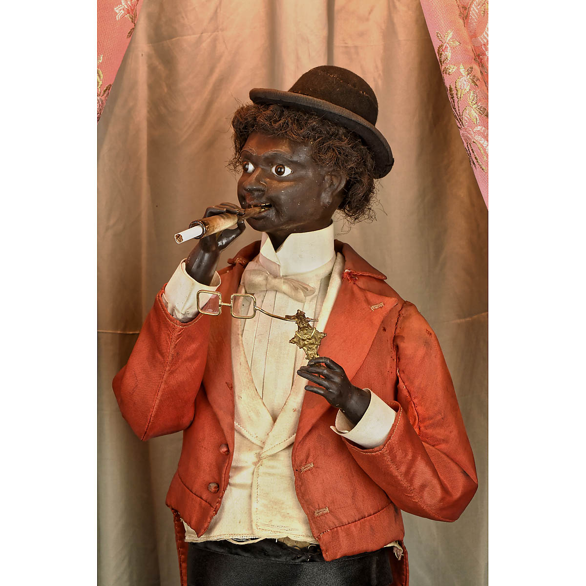 Depicting an elegant black dandy with papier-mâché head, brown glass eyes, bisque hands holding lorgnette and cheroot-holder, red tailcoat, original cream satin waistcoat and black breeches, shapely papier-mâché body containing bellows and original non-operative clockwork motor. A separate electric motor causes the gentleman to turn his head, raise a lighted cigarette to his lips, incline his head, exhale the smoke and then lift the lorgnette inquisitively. In marbled wood cabinet with glazed upper section and paneled base with door, figure 22 ¾ in. (68 cm) with hat, cabinet: approx. ht. 80 x wd. 37 ½ x dp. 18 ½ in. (202 x 94 x 63,5 cm), two fingers repaired on left hand. Good working condition and an impressive smoker! – Provenance: Former collection of Atracciones Apolo, an indoor amusement park opened by Josep Vallés Rovira on Parallel Avenue, Barcelona, in 1935. One of the park's most famous attractions was the Museo las Maravillosas Figuras en sus Dioramas (Museum of Marvellous Figures in their Dioramas), a collection of 19th century French automata in fantasy settings designed and painted by the artist Martí Llauradó. – According to an article published by Edición del Domingo on 19 August 1990, the Apolo's automata museum closed in 1957. The automata were stored, forgotten, for almost fifty years until acquired by the Museum of Toys and Automata in Verdú. A rare and historic piece from one of Spain's oldest amusement parks. – References: "A Great and Magical Collection", museum catalogue, pp. 313–325; Ròmul Brotons, "Parcs d'Atracciones de Barcelona", pp. 143–147; Auction Team Breker, 7. November 2015, Lot 628 and 5. November 2016, Lot 530 for other Apolo automata from the series.