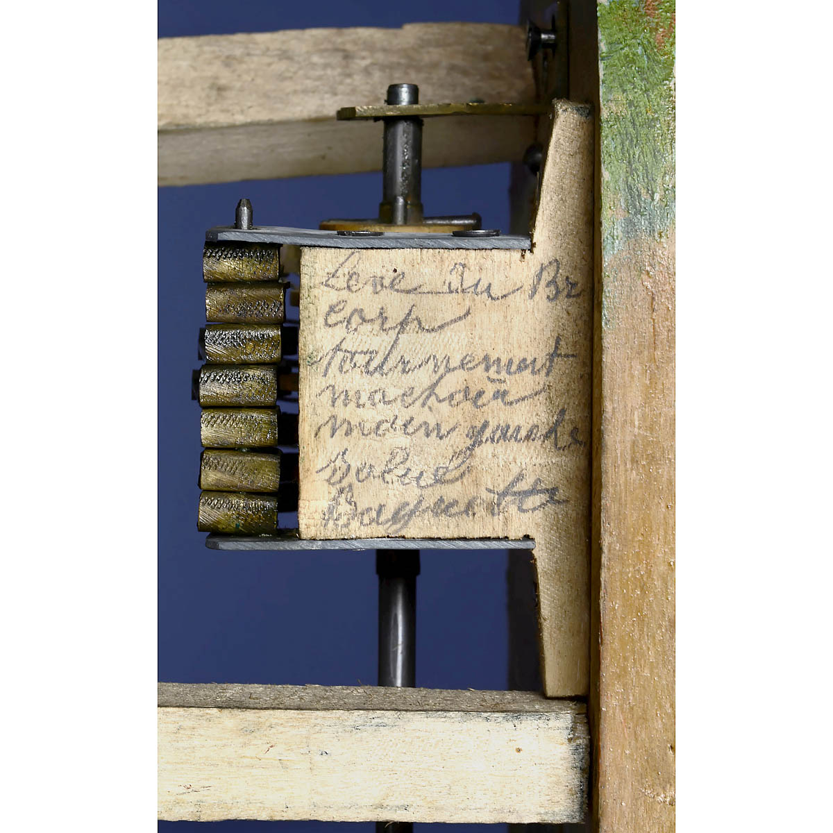 Depicting a mathematics master at the lectern and his pupil standing on a stool to reach the board, both figures with papier-mâché heads, carved wood hands, articulated mouths and original satin costumes, the master in a frock coat and cap, the pupil in silk breeches and paper-trimmed jacket, on ebonized base containing two-air pull-string cylinder movement, No. 15097, with tune-sheet ("Les Roses Valse" and "La Fille de Mme. Angot, Conspirateur") and stamp of "J. Phalibois", the going-barrel motor, No. 503, with nine boxwood cams, indistinct horologist's stamp and oval stamp: "J. Phalibois à Paris", ht. 16 ½ in. (42 cm), schoolmaster's mouth inactive, leather on pupil's upper lip split. – The master turns his head, blinks and leans forwards as he points at the board, then lifts and extends his book. The pupil, meanwhile, looks from board to master, chatters and writes away, hoping that his teacher will not notice the cartoon of a bearded and spectacled professor he has drawn in the lower left corner. – The automaton was probably displayed at the third Exposition Universelle which attracted more than 13 million visitors to the Palais du Champs de Mars in Paris from 1 May to 31 October 1878. The base has two ink stamps of "Exposition Universelle 1878, J. Phalibois, Paris, Pièces Mécanique, Fantasies à Musique". Phalibois exhibited in the toy section (Classe 42), described in the "Guide Conty de l'Exposition Universelle de 1878" as containing "toys of every description, each more ingenious than the last". A rare and amusing automaton in good, original working condition.