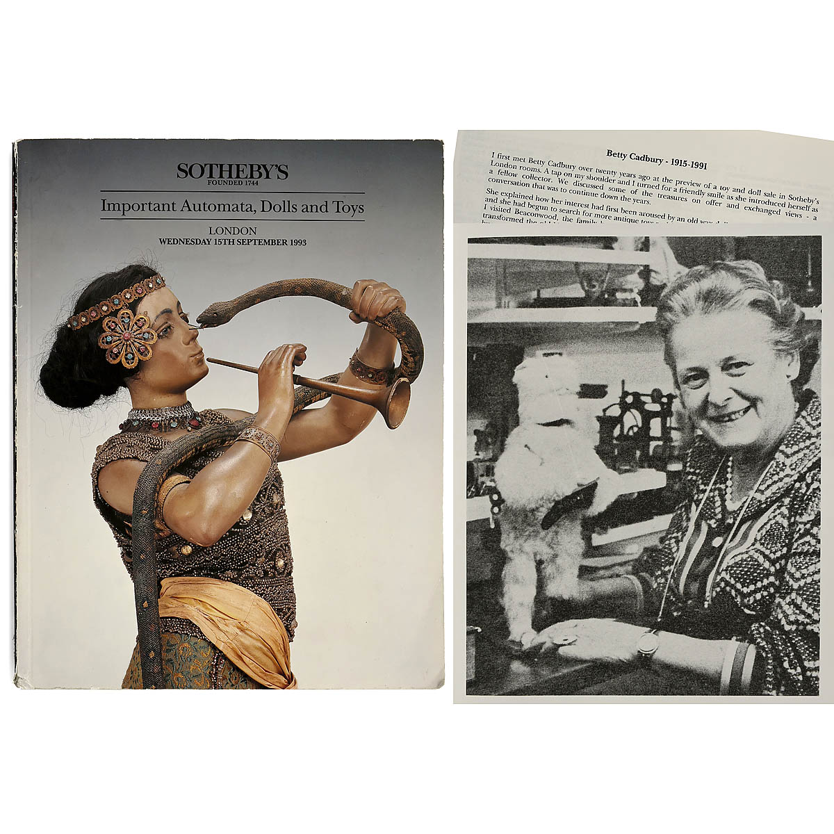 With leather-covered head, defined cheekbones and facial structure, open mouth with carved teeth, brown paperweight eyes, curly black Astrakhan wig and brass hoop earrings, holding a gilt-metal edged tray decorated with leaves, ribbons and three upturned papier-mâché fruits: an apple, a pear and an orange, the figure elaborately dressed in pink satin brocade jacket with filigree gilt buttons, lace jabot, bowtie and red velvet breeches, ht. 26 ½ in. (67 cm). With acorn-form stop/start and original red-painted brass key lightly stamped "G.V.". Good, sympathetically restored working condition. – The fruit seller turns and inclines his head to the left and right as he inspects his wares which open in turn to reveal 3 mechanical illusions. Under the apple is a monkey blinking and looking from side to side, under the pear a waltzing couple (male dancer replaced) and under the orange a white mouse running in circles. The fruit seller gazes up at his audience, his eyelids fluttering to heighten the illusion of life. – The Fruit Seller was offered in the 1884 catalogue of the Silber & Fleming department store in London for the princely price of £ 7,7 shillings. The strange contents of the fruit seems to belie the special restraints of the deceptively shallow tray. Concealed behind a metal plate on the underside are three gear trains to animate the monkey, dancers and mouse and three levers that open the fruits. The exotic figure, his enchanted fruits and the mechanical ingenuity of the automaton's construction represent the most magical elements of Gustave Vichy's work. – Provenance: Sotheby's London, 15 September 1993, Lot 306, former collection of Betty Cadbury (1915–1991), Rednal, Birmingham. – Betty Cadbury, a collector and historian, authored her influential work "Playthings Past, a Collector's Guide to Antique Toys" in 1976, explaining that she "was concerned with the changing attitudes of children towards their toys and the social and economic conditions which influenced their purchase". In 1973 Cadbury presented her collection (including the automaton offered here) to the public in a B.B.C. documentary hosted by Arthur Negus. She was also instrumental in establishing the National Trust Museum of Childhood by installing the substantial collection of Playthings Past at Sudbury Hall, Derbyshire, in 1983. – A rare and wonderful Vichy automaton with significant provenance.
