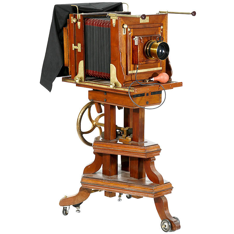 Mackenstein,15Rue des Camera,size30x30cm,高级木制,带黄铜附件,Cooke Portrait Anastigmat4.5/12.75英寸(350mm)Serie ⅡE,带红色边角的黑色皮腔,对焦屏后背,焦平面快门工作,带三脚架,曲柄机构,带三脚架的相机高度140cm.