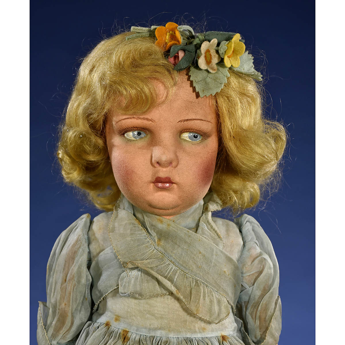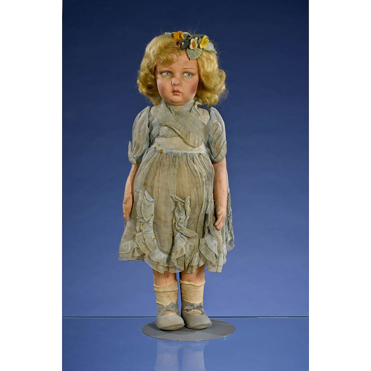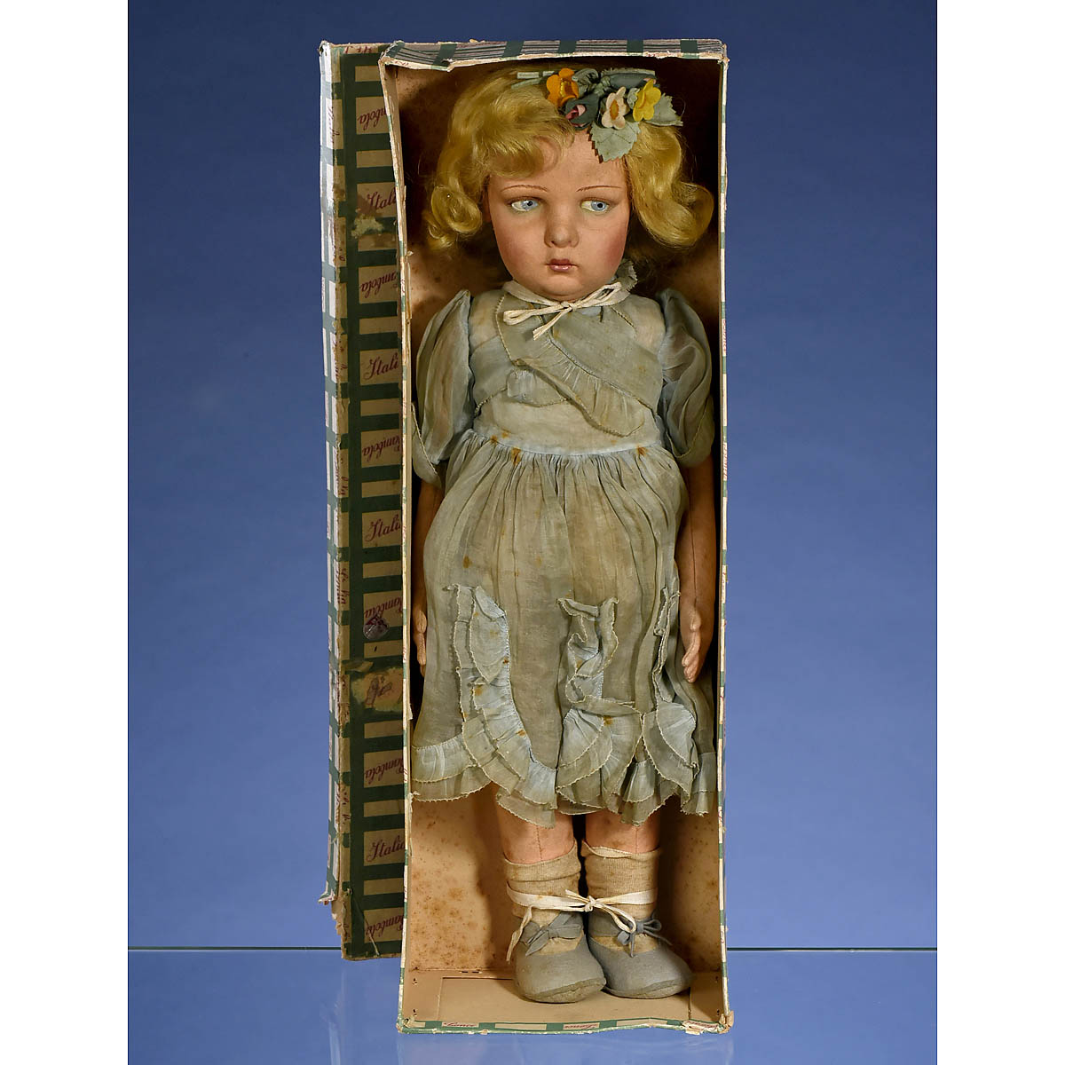 With pressed-felt head, rosebud mouth, side-glancing blue eyes with long curly lashes and softly feathered brows, original wavy blonde mohair wig, cloth torso and jointed felt limbs, dressed in original powder-blue organza dress, socks and matching shoes, ht. 21 in. (53 cm), tiny rub on nose, light spotting on body and dress, otherwise excellent. In original "Lenci Bambola" box (one flap defective) with fixing cords. A beautiful Lenci doll with soulful expression, original costume and box.