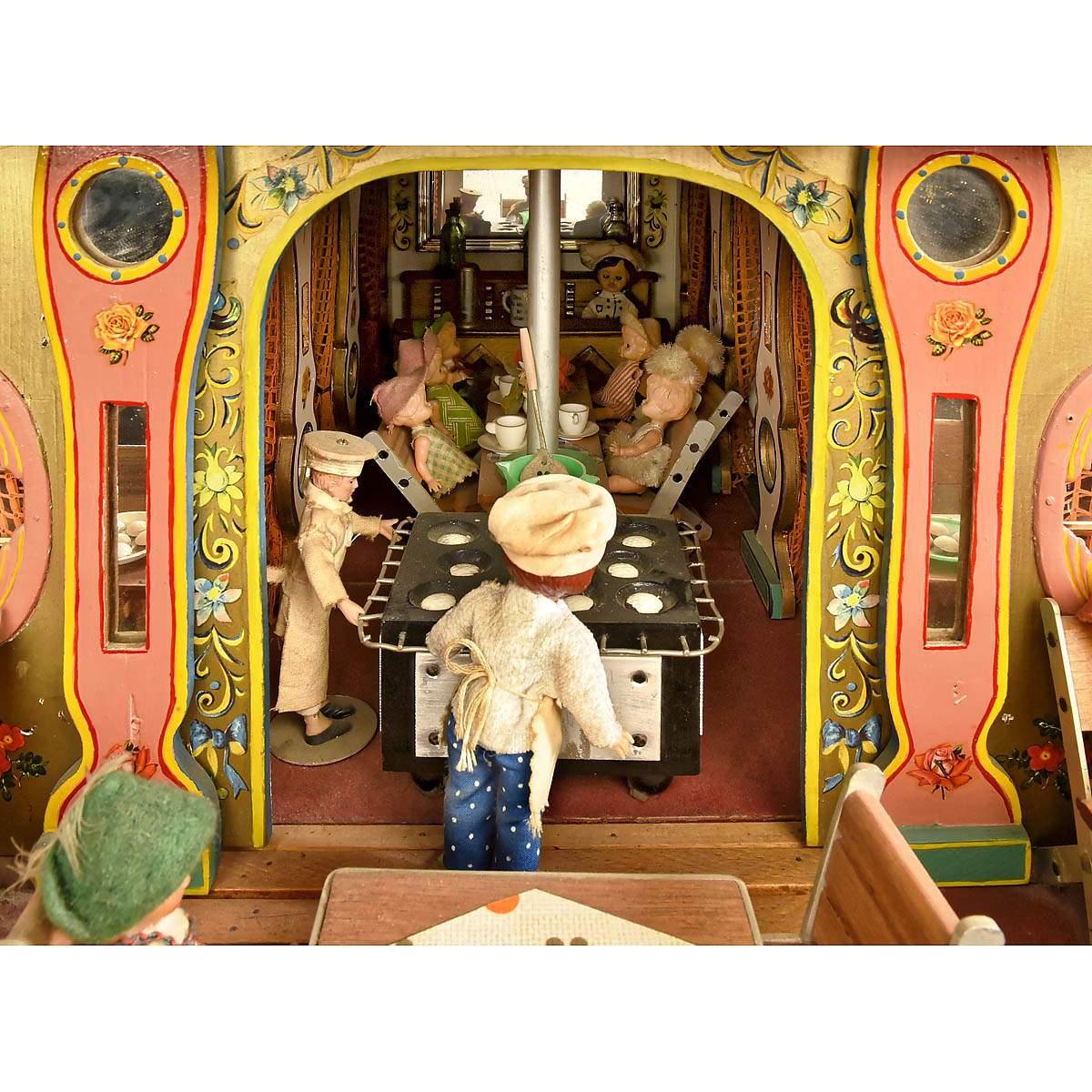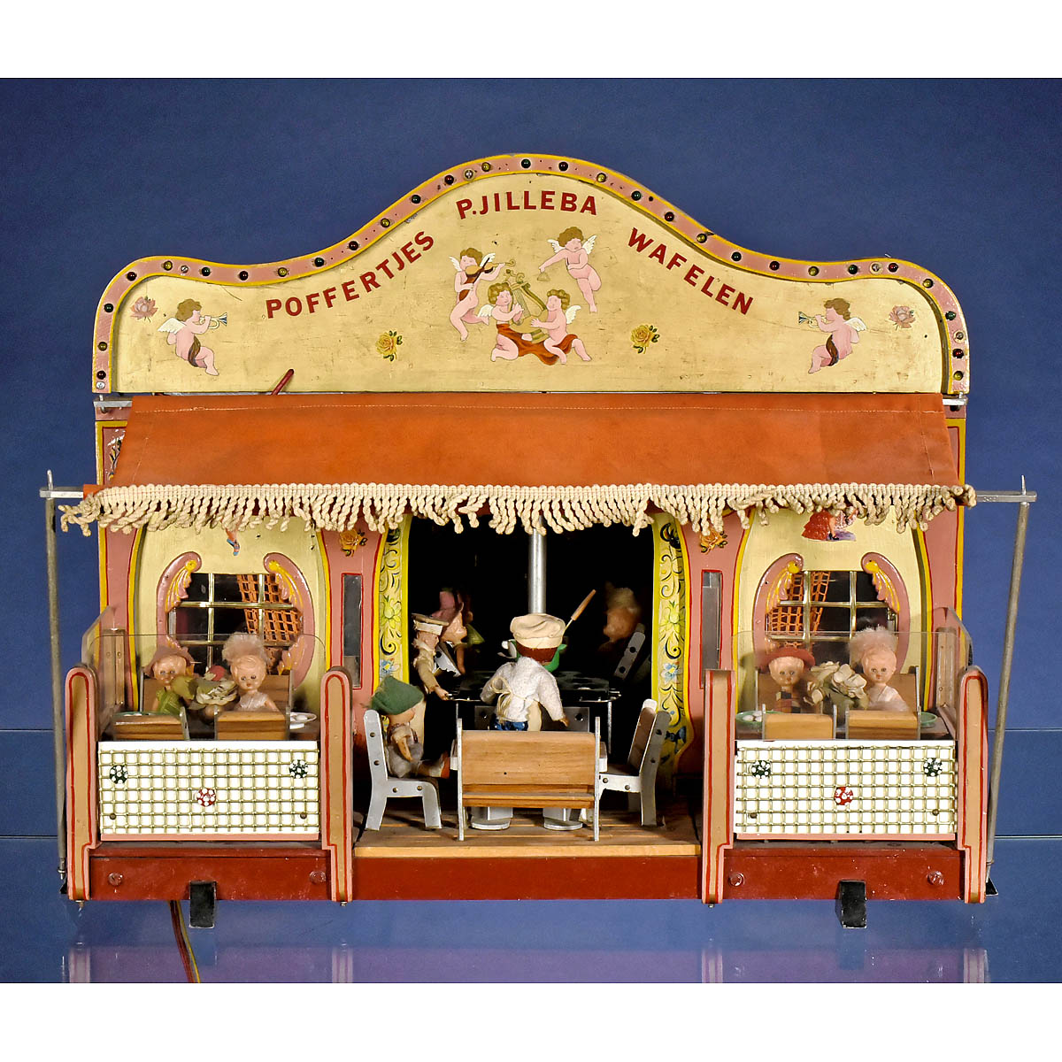 Coffee house with waffle bakehouse, costly interior decoration with bar, mirrors, tables, chairs, booths and Poffertjes stove, 14 dolls, veranda with tables and benches, illumination partly inactive, detailed made of wood, canvas and further materials, size 23 3/5 x 26 3/4 x 19 5/8 in.