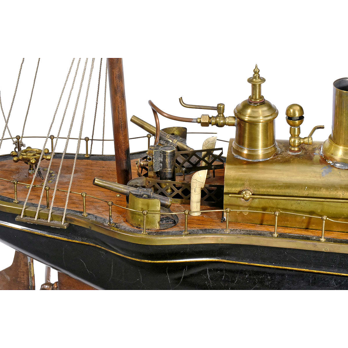 In the style of Radiguet & Massiot, hand-pressed tin and lead hull, copper- and black-painted, wood deck with painted plunks, masts with crow's nests, central brass boiler with oscillating cylinder, 5 rotating brass cannons and adjustable rudder, length 24 4/5 in. An impressive model!
