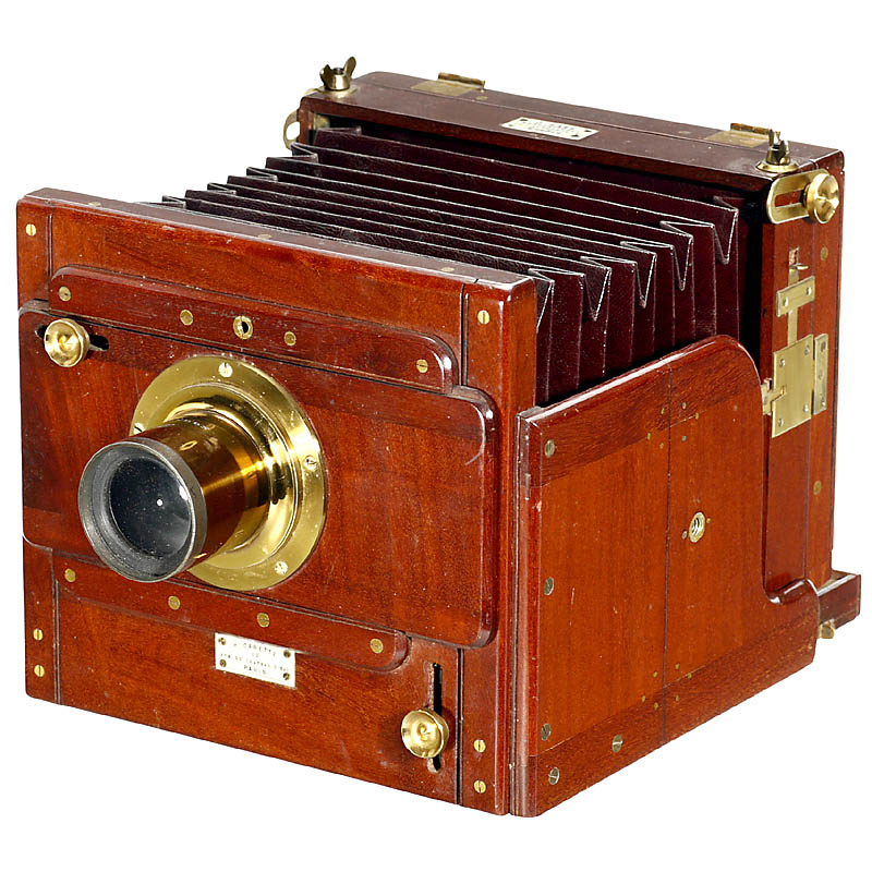 George Hare,26Calthorpe Street,伦敦,for H.Carette,12,Rue Du Chateau D´Eau ,巴黎,外景相机,红木制带黄铜附件,size 5x7in.,酒红色方形皮腔,伦敦Ross铜镜头Rapid Symmetrical 8.5x6.5,No.129616,对焦屏后背,有镜头盖。