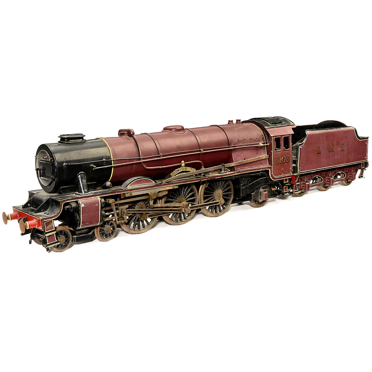 A finely engineered 39 in. long 4-6-2 model locomotive, "Royal Scots Fusilier No. 6103", charcoal-fired, tender with water tank, complete with all fittings, weight approx. 30 kg.