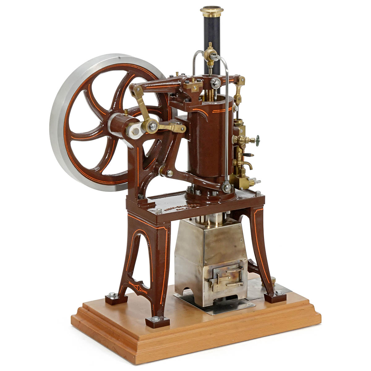After the American original machine from 1888, parts made by Werner Wiggers. Power piston and displacer within one cylinder, water-cooled, 8 ¾-inch flywheel, overall size 14 1/5 x 8 3/4 x 20 ½ in., vaporizing burner. – A well-constructed working model.