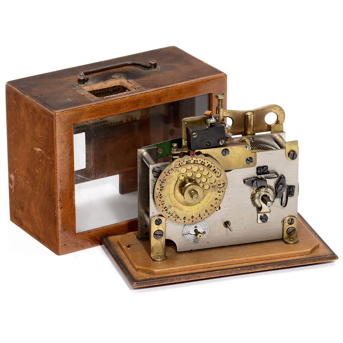 Clockwork-driven, 24 hours, adjustable cam disc, switching capacity up to 200 watt, in glazed wooden case, width 6 ¾ in., working.