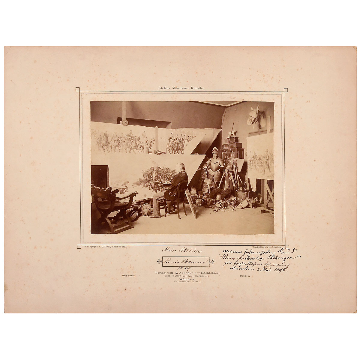 1) Photograph "Mein Atelier – Loccio Braun 1889", Munich, size 6 x 8 ¼ in., card size 12 ½ x 16 in. – And: 2) Wood engraving "Ein Pariser Straßenphotograph" (A Street Photographer in Paris), c. 1880, drawing by F. v. Haenen, size 8 ¾ x 12 ½ in., colored, passepartout size 16 x 20 in.
