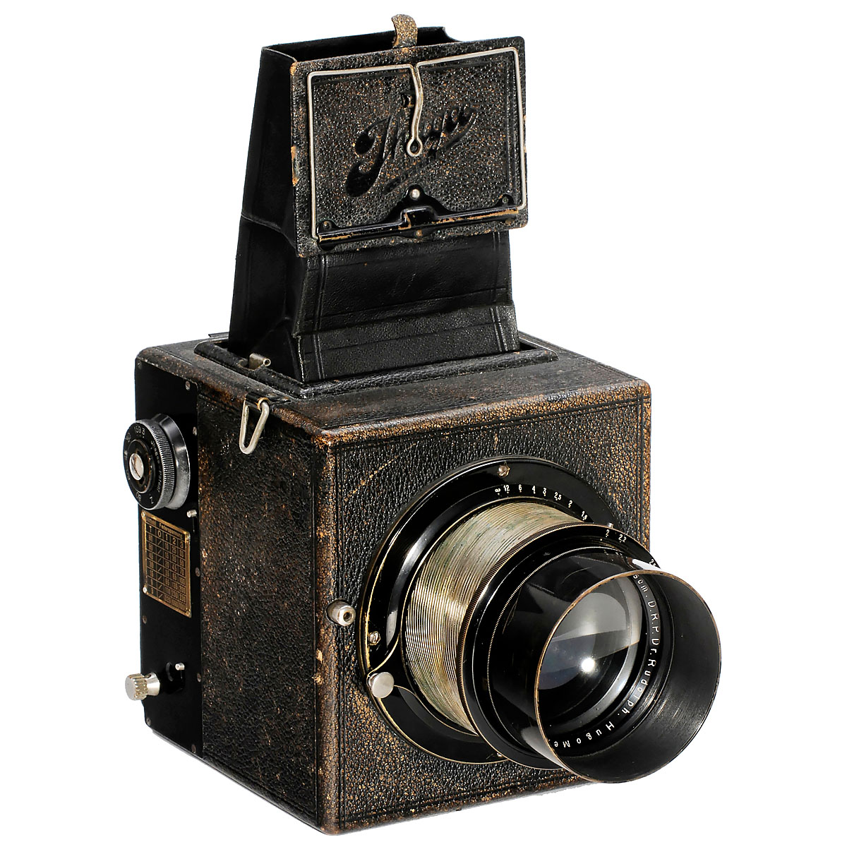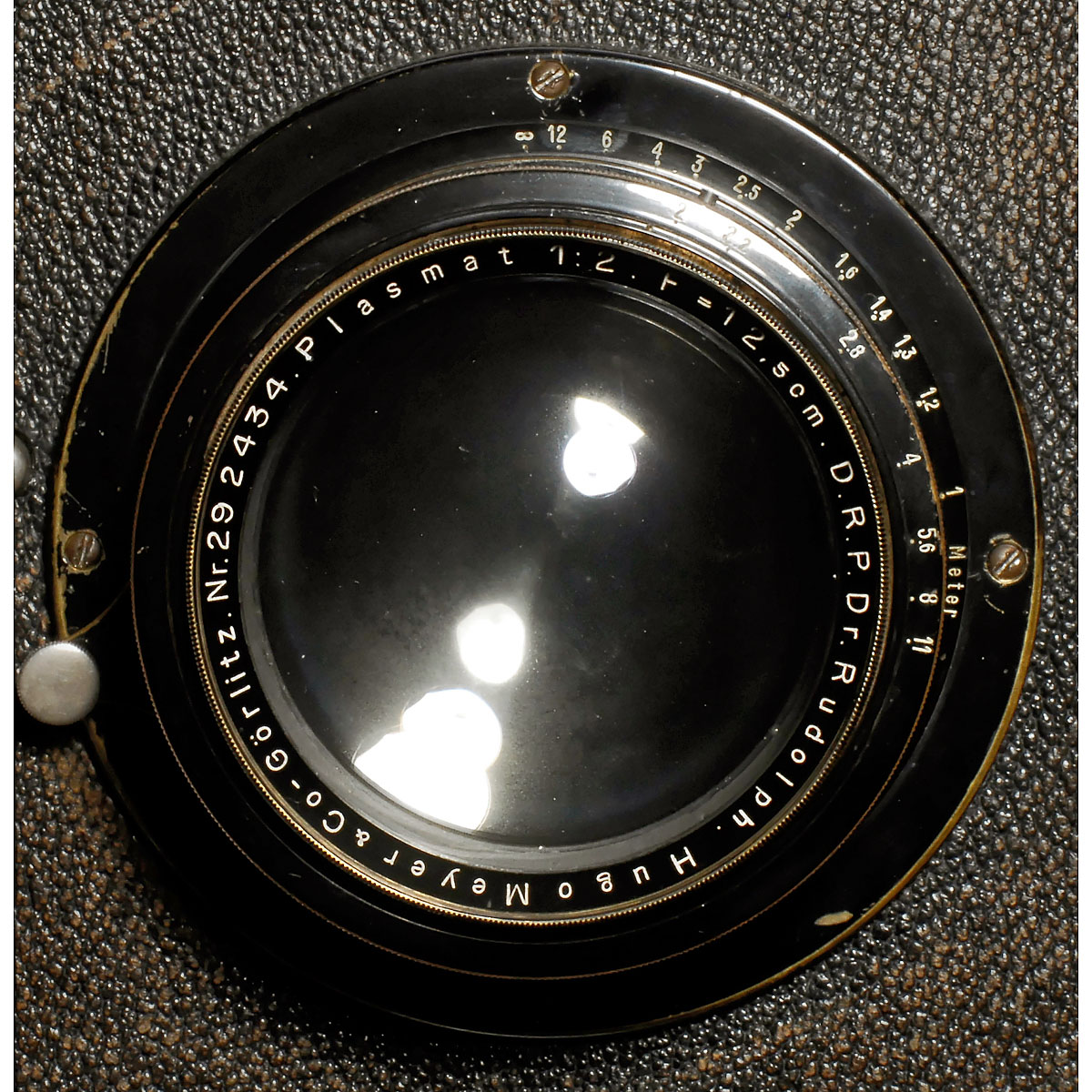 Ihagee, Dresden. SLR camera, plate size 6,5 x 9 cm, body no. 277794, with Hugo Meyer Plasmat 1:2 F=12,5 cm, no. 292434, cassette, focal plane shutter 1–1/1000 sec. (working). – Very rare SLR camera!