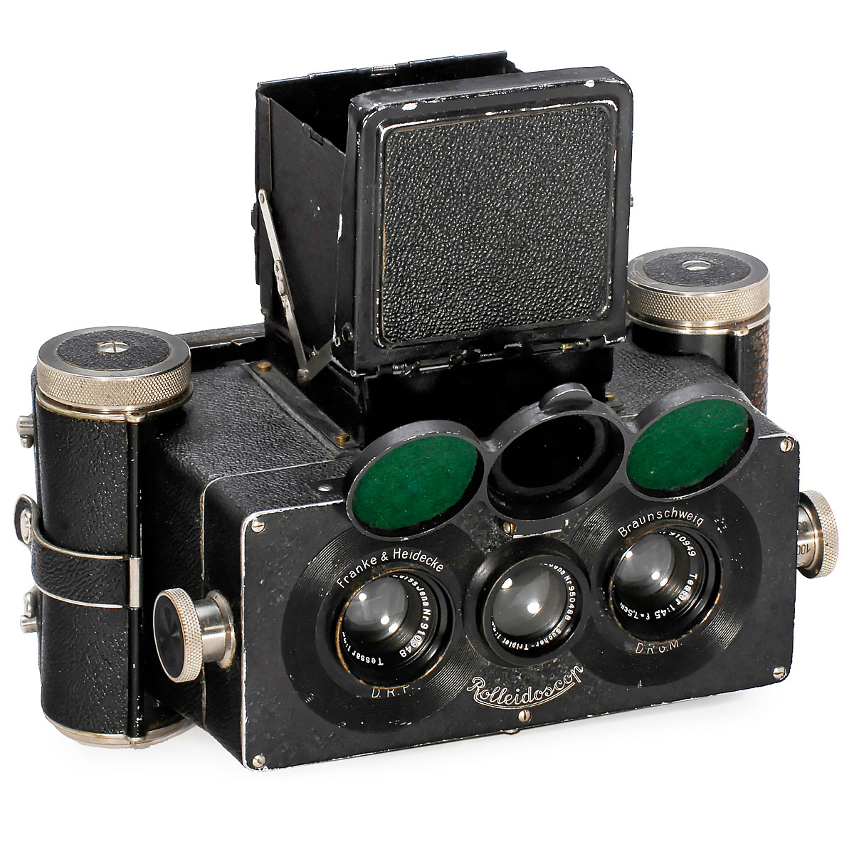 Franke & Heidecke, Braunschweig. No. 16659, stereo camera for 120-rollfilm, image size 6 x 6 cm, lenses: 2 x Tessar 4,5/7,5 cm, "Sucher-Triplet 4,2/7,5 cm", stereo shutter B, Z, 1–1/300 sec., with case.