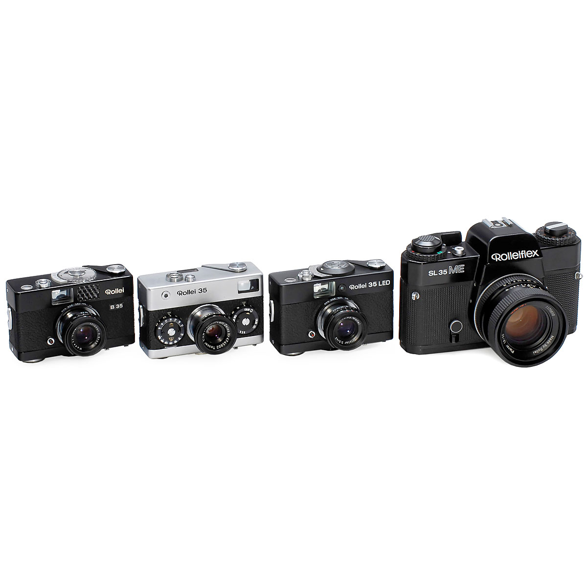 Rollei, Braunschweig. 1) Rollei 35, no. 3100284, "Made in Germany", with Tessar 3,5/40 mm, long shutter speeds stuck. (3/3) – 2) Rollei B35 with Triotar 3,5/40 mm (2-/3) – 3) Rollei 35 LED with Triotar 3,5/40 mm. (2-/3) – And: 4) Rolleiflex SL35ME, with Planar 1,8/50 mm.(2–3/–) – Light meters not tested.
