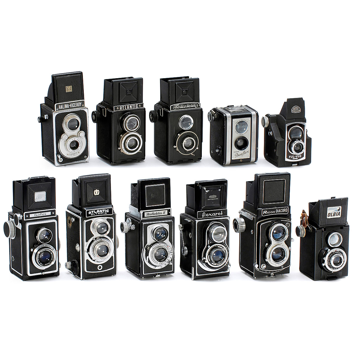 1) Zeiss Ikon, Stuttgart. Ikoflex Ia, 854/16, c. 1950, Zeiss-Opton Tessar 3,5/75 mm T, Prontor S. (3+/2) – 2) Montanus-Camerabau in Solingen. Atlantic Olympia (Delmonta), export version, Pluscanar Anastigmat 3,5/75 mm in Vario. (4/6+) – 3) Welta, Freital. Reflekta II, 1951, Meritar 3,5/75 mm in Prontor-SV. (3/4-) – 4) Meopta. Flexaret III, 1950, Mirar 3,5/80 mm in Prontor II. (3/4+) – 5) Riken, Tokyo. Ricoh Diacord, c. 1957, Rikenon 3,5/8 cm in Citizen-MV. (3+/3-) – 6) Olbia, Paris. Olbia (reflex), c. 1947, Trylor 4,5/75 mm in Gitzo. (3/3) – 7) Haking, Hong Kong. Halina-Viceroy, c. 1960, Haking's Double Meniscus F:8, I + B. (3/6) – 8–9) 2 "Jubitel" models with other names. (3-/–) – 10) Ross, London. Ful-Vue Super, 1954, reflex style 6 x 6 cm. (3/2–3) – And: 11) Kodak, England. Duaflex, c. 1947, reflex style 6 x 6 cm. (3/2)