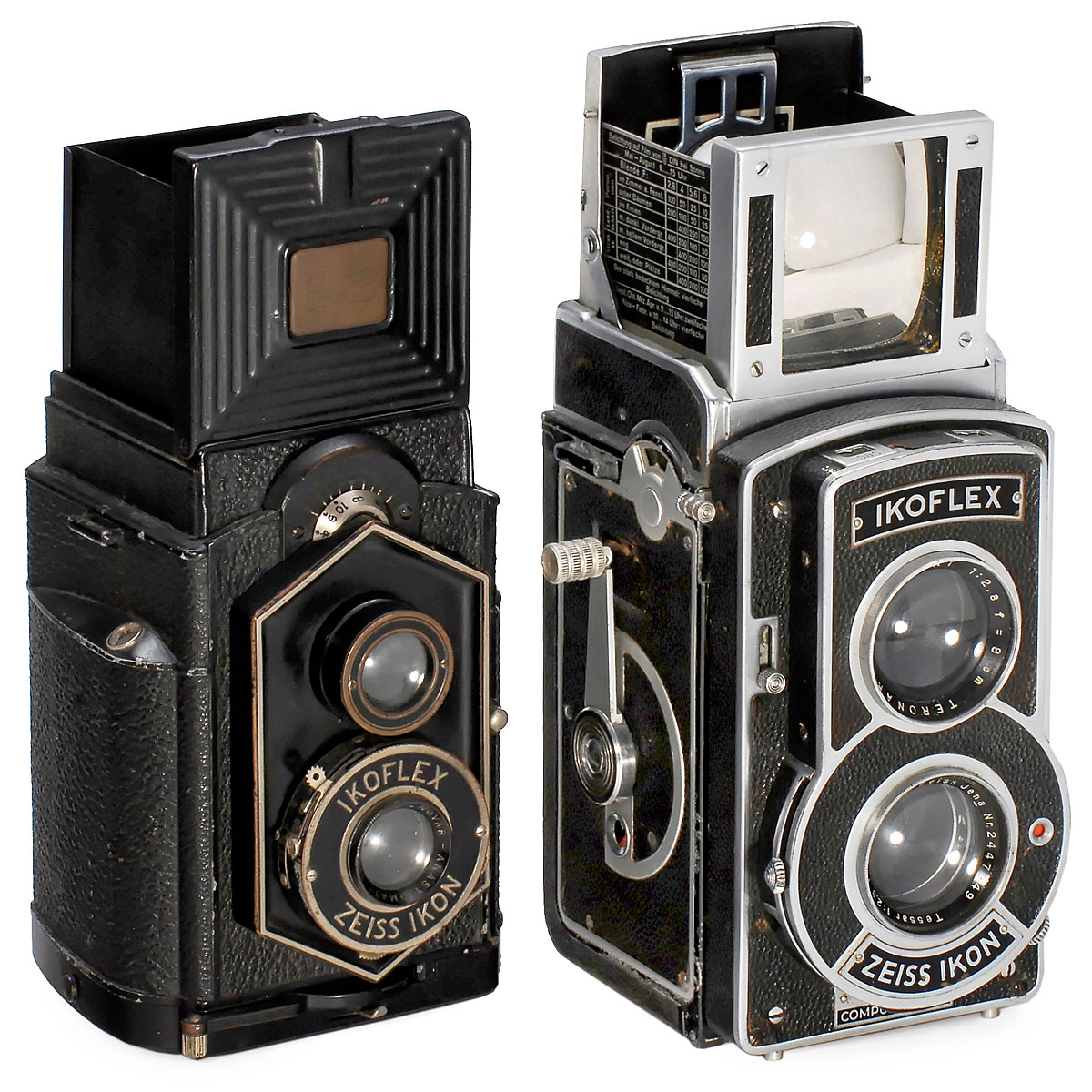 Zeiss Ikon, Dresden. 1) Ikoflex 850/16, 1934, Novar Anastigmat 4,5/8 cm, shutter 1/25–1/100 sec., early version with Art-Deco finder-hood. (3/2–3) – And: 2) Ikoflex III 853/16, 1939, no. L61363, Tessar 2,8/8 cm in Compur-Rapid. (3/–)