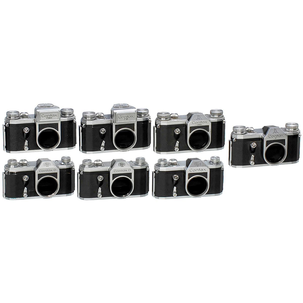 VEB Zeiss Ikon, Dresden. 1) Contax S (version "D-2"), no. 44301, 4/1951–12/1951, version with self-timer. (2/2) – 2) Contax D (large "D"), 1952, "Zeiss Ikon VEB" logo, in bold script, no. 148322. (2/3) – 3) Contax D (large "D"), 1952, "Zeiss Ikon VEB" logo, in fine script, no. 5008500. (3/3) – 4) Contax F, 1956, "Ernemann Tower" logo, no. 403017. (3–2/3) – 5) Contax FB, 1956, built-in light meter, working, no. 5048884. (3/3) – 6) Contax FM, 1958, "Ernemann Tower" logo no. 5087599. (3/5) – 7) Contax FBM, 1958, built-in light meter (working), no. 477666, export version. (2-/2-) – Literature: Alexander Schulz, "A History of the World's First 35 mm Prism SLR Camera" and Richard Hummel, "Spiegelreflexkameras aus Dresden".