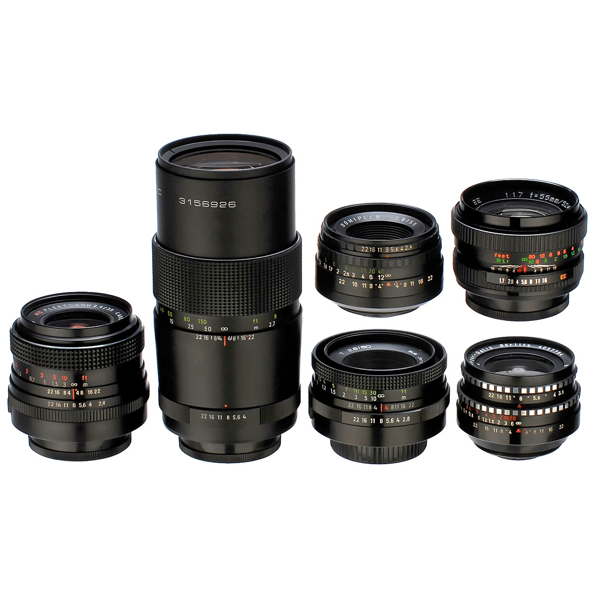 1) Zeiss Jena, Tessar 2,8/50 mm, no. 4712787, chrome. – 2) "aus Jena DDR", T 2,8/50 mm (Tessar), no. 356178, black. – 3) Zeiss Jena, MC Flektogon 2,4/35 mm, no. 10249409, black. – 4) Jena S 4/135 mm (Sonnar), no. 6308145, chrome. – 5) Pentacon auto 4/200 mm MC, no. 3156926, black. – 6) Domiplan automatic lens 2,8/50 mm, black. – 7) Exaktar EE 1,7/55 mm, no. 762975, black. – And: 8) Meyer-Optik, Lydith 3,5/30 mm, no. 4057794, black.