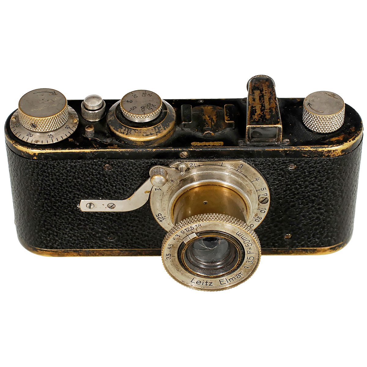 Leitz, Wetzlar. 1) Leica (A), no. 28238, 1930, Elmar 3,5/50 mm, meter. Brassing, good technical condition. (3-/2) – And: 2) Leica Standard (E), no. 212534, 1936, Elmar 3,5/50 mm, meter, nickel. (3/3)