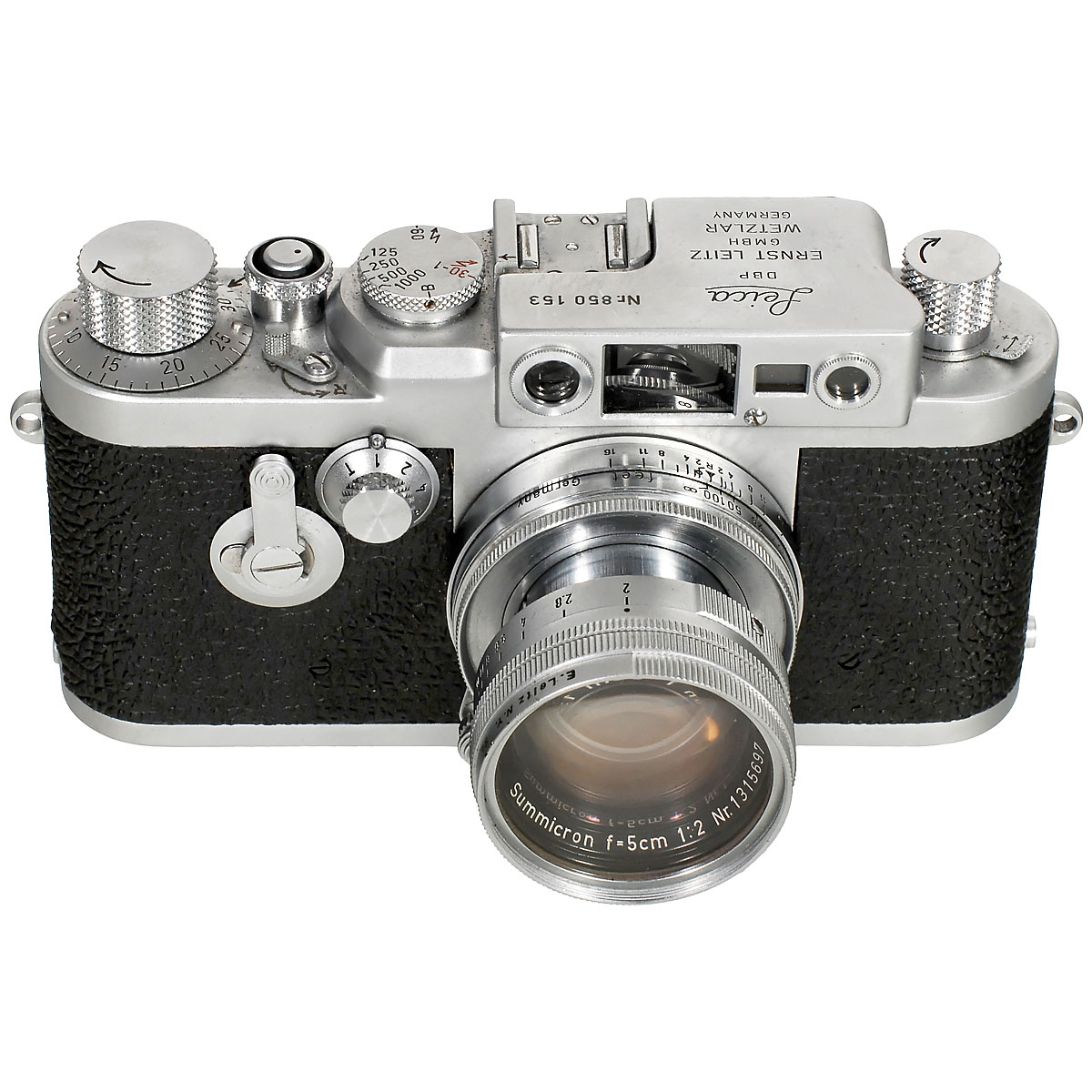 Leitz, Wetzlar. No. 850153, early type advance knob, Summicron 2/5 cm, no. 1315697, collapsible, feet, with E. Leitz N.Y. Skylight filter. With case.