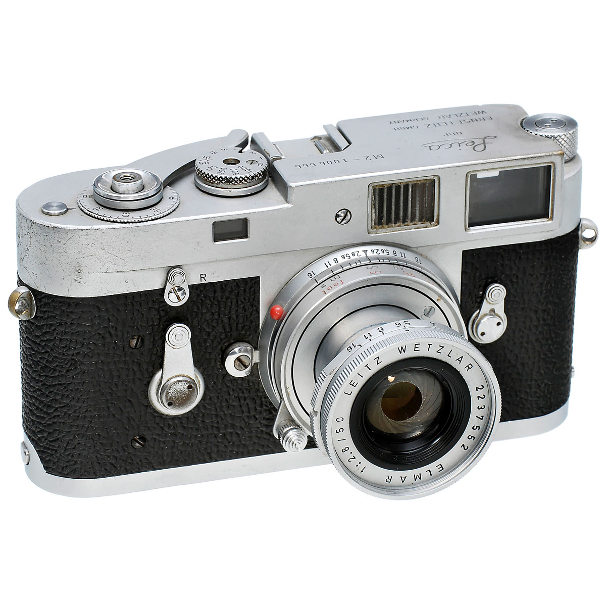 Leitz, Wetzlar. No. M2-1006666, chrome, rewind lever, self-timer. In technically good working condition, but heavy signs of wear. With Elmar 2,8/50 mm, no. 2237552, good condition, lens cap.