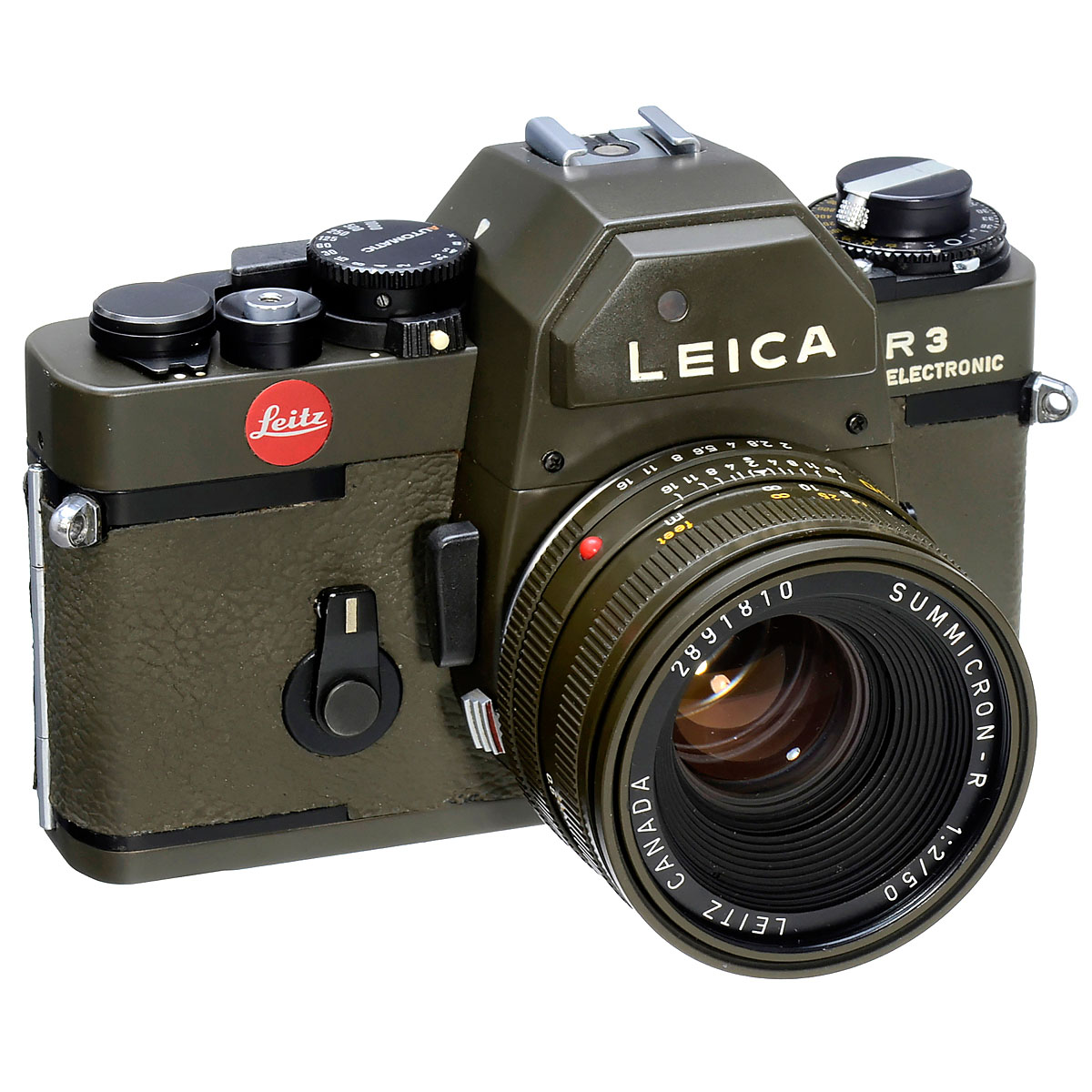 Leitz, Portugal. Leica R3 electronic, special green safari look, no. 148327, number of limited edition E901, leather covering on back slightly loose. With Summicron-R 2/50 mm lens, Canada, no. 2891810, in matching green safari finish, Leica R-cam only.