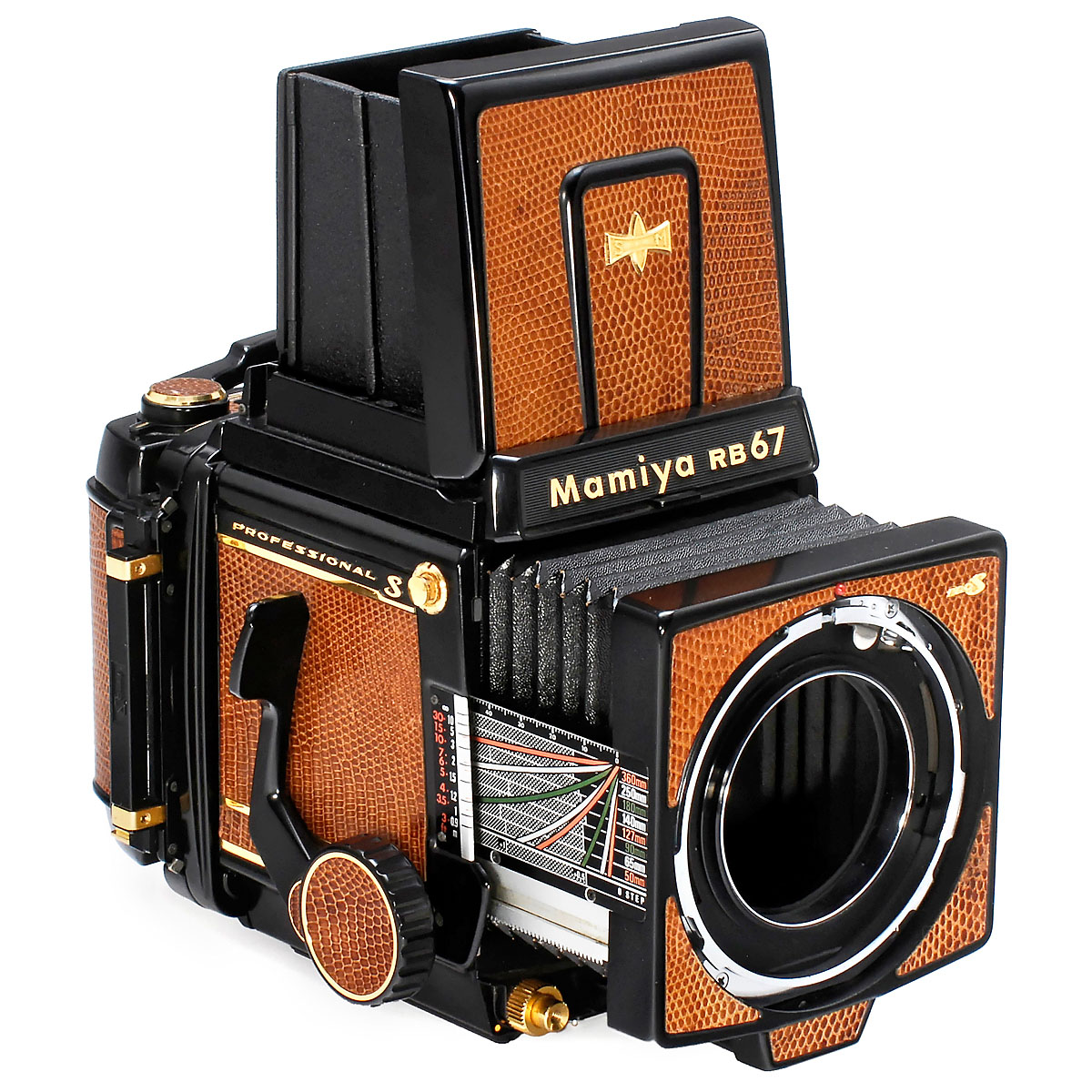 Mamiya, Japan. RB67 Pro-S, no. C213245. Limited edition of 300 examples for the 11th anniversary of the RB67, gold-plated metal parts and lizard-skin covering, with 120-film magazine.