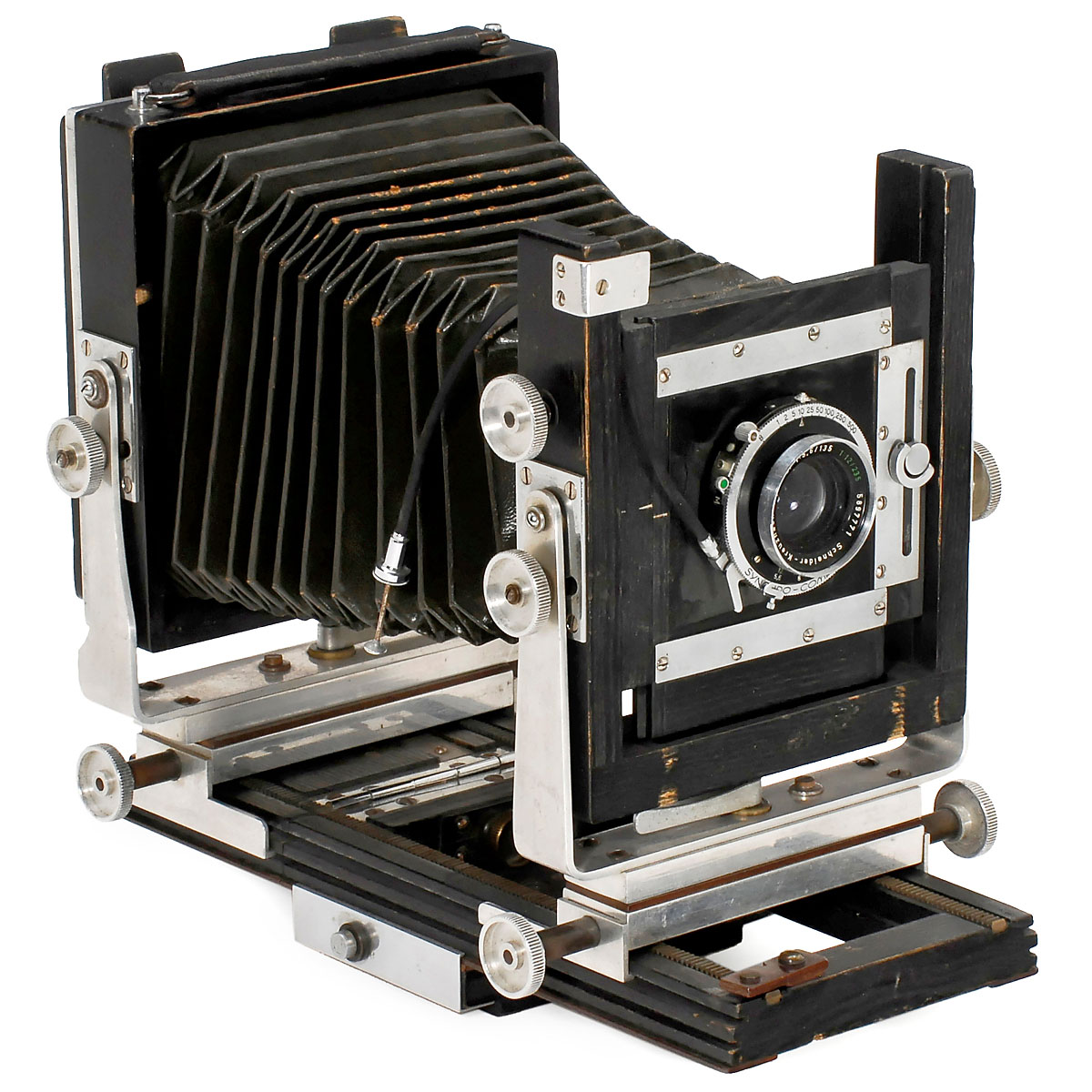 S. Szabad, Stockholm, Sweden. Black-lacquered wood body with chromed fittings, plate size 9 x 12 cm, with international focusing screen back (plate holder), lens Schneider 5,6/135 mm, 10 plate holders.