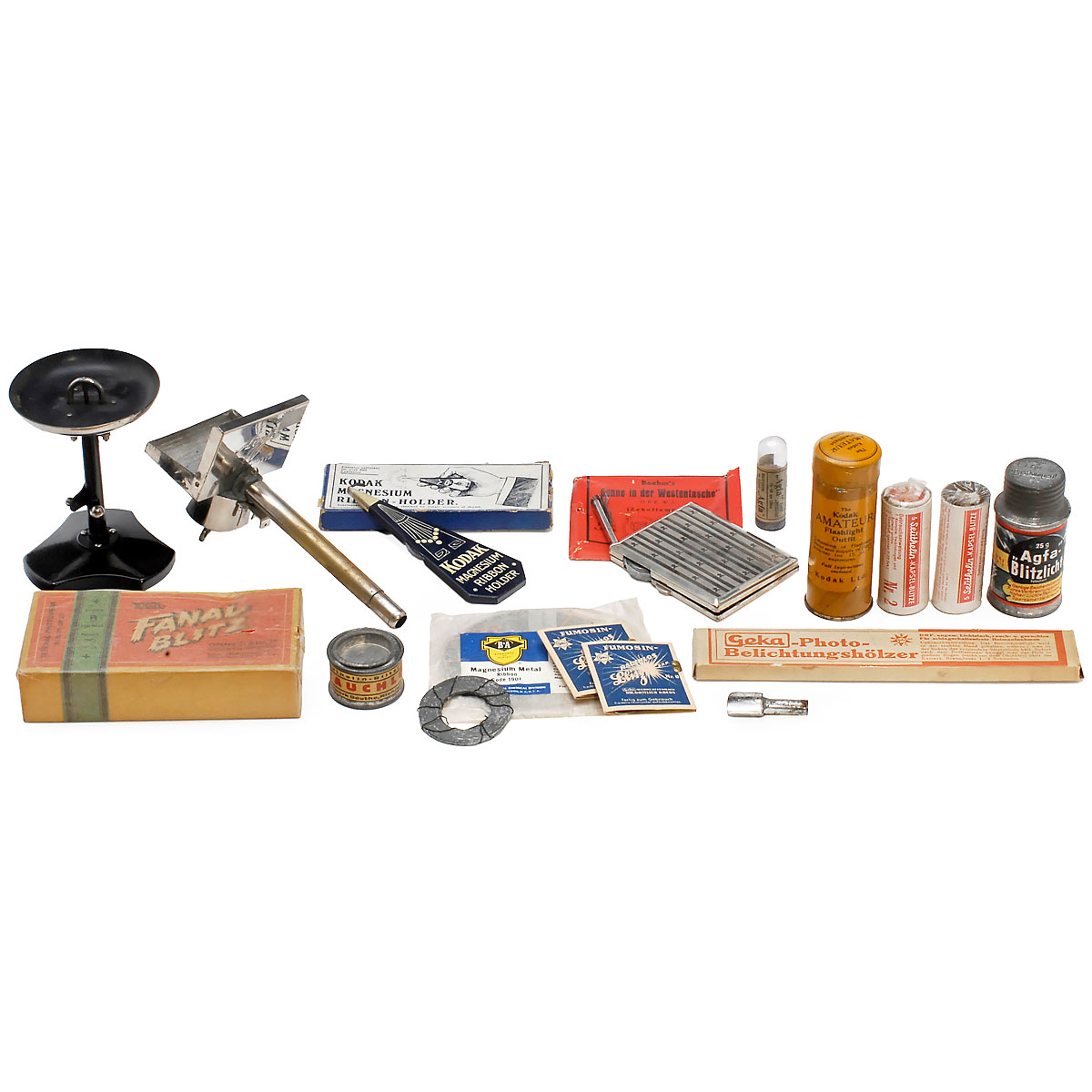 1) Ica "Lumen" flashlamp. – 2) Agfa flashlamp (inoperative). – 3) Kodak magnesium ribbon-holder, boxed. – 4) Boehm's Sonne, in original sleeve. – 5) The Kodak Amateur Flashlight Outfit. – And: 6) Expendables: Fanal flash bags, Geka lightning matches, Agfa flash powder, Senthelin flash cartridges and more.
