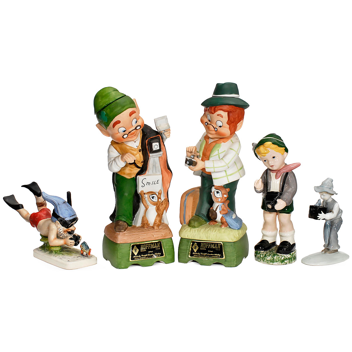 1) Goebel. "Co-Boy" (The diver), height 5 in. – 2) Boy with camera and bird, height 6 in. – 3) Boy with rollfilm box, height 9 in. – And: 4–5) 2 advertising figures "Photographer" (Hoffman Kentucky Straight Bourbon Whiskey), 11 in., with musical movement, Made in Japan.