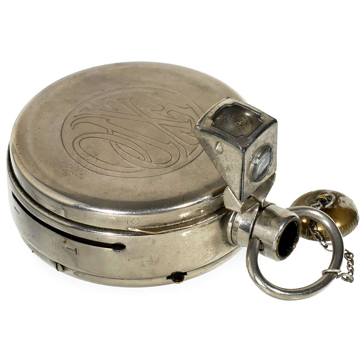 Expo Camera Co., New York. Subminiature camera, disguised as a railroad pocket watch, size 16 x 22 mm, nickel body, shutter I + T (working well), with rare viewfinder and lens cap.