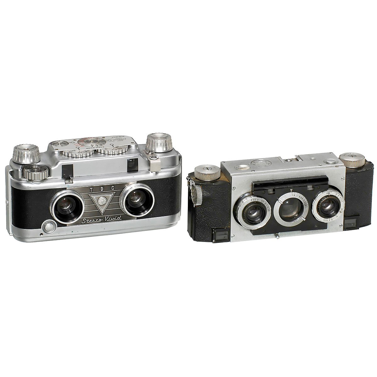 TDC Co., Chicago/Bell & Howell, USA. For 35mm film, 24 x 23 mm, 2 x Tridar 3,5/35 mm, shutter 1/10–1/100 sec., rangefinder (coupled), mechanical exposure control. – Literature: Werner Weiser, "Stereo Cameras Using Film", p. 120. (3/2-) – In addition: Stereo Realist, model 1041, c. 1947, 24 x 23 mm, David White Anastigmat 3,5/35 mm, lens cap broken, shutter not working. (4/5)