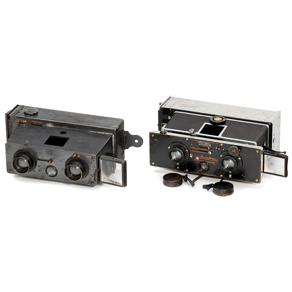 1) Ica A.G. Dresden. "Polyscop" No. 606, 1912, size 45 x 107 mm, body no. 1146, 2 x Tessar 4,5/62 mm, shutter Z, 1/3–1/250 sec., with nickel-silver magazine for plates, Newton viewfinder blind. (3/3) – And: 2) Jules Richard, Paris. "Verascope Simple", c. 1899, size 45 x 107 mm, 2 simple lenses, shutter I. + P., magazine. (3+/3+)