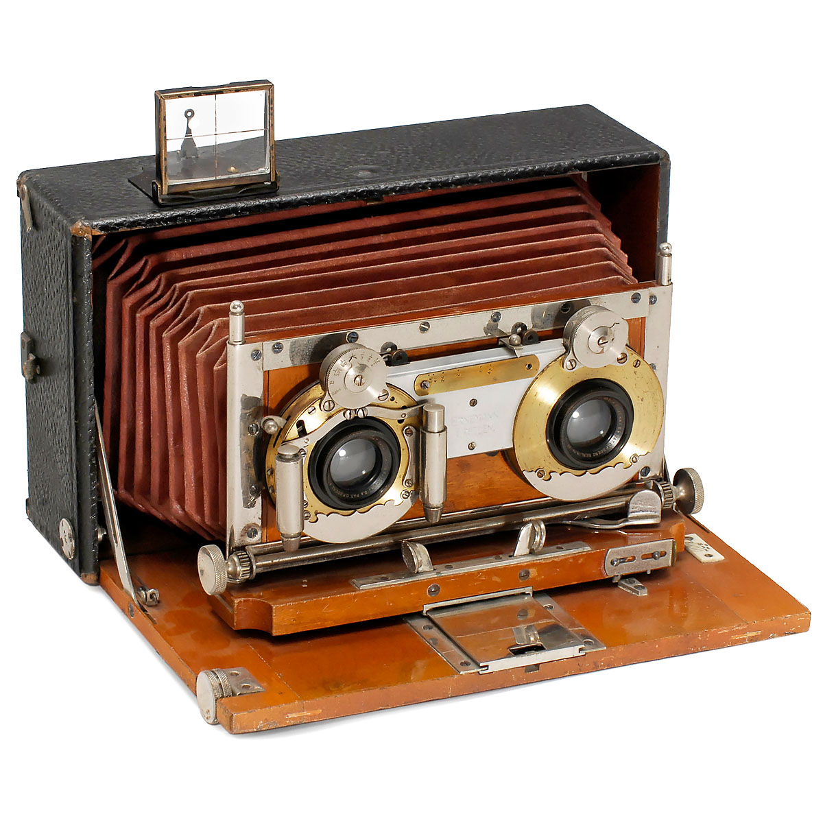 Ernemann, Dresden. Size 9 x 18 cm (2-times 8 x 8 cm), black leather covering, polished wood body, dark-red bellows, 2 x Goerz Dopp.-Anastigmat series III Dagor 6,8/120 mm, shutter 1–1/100 sec., back missing.