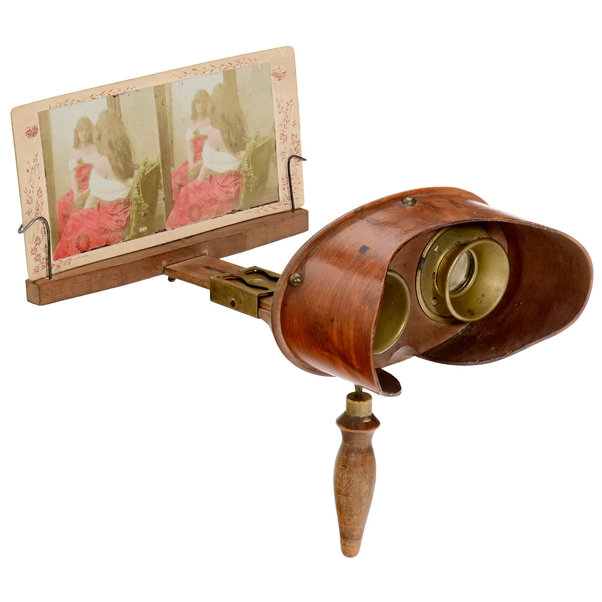 1) Stereoscope for cards and slides of 9 x 18 cm, ogee-form burr-veneered body, unusual focusing via a vertical shaft, diameter of oculars 4 cm, small cracks in the lens-holders, ground-glass replaced, rare viewer. (3–4/3) – 2) Brewster-type stereoscope,