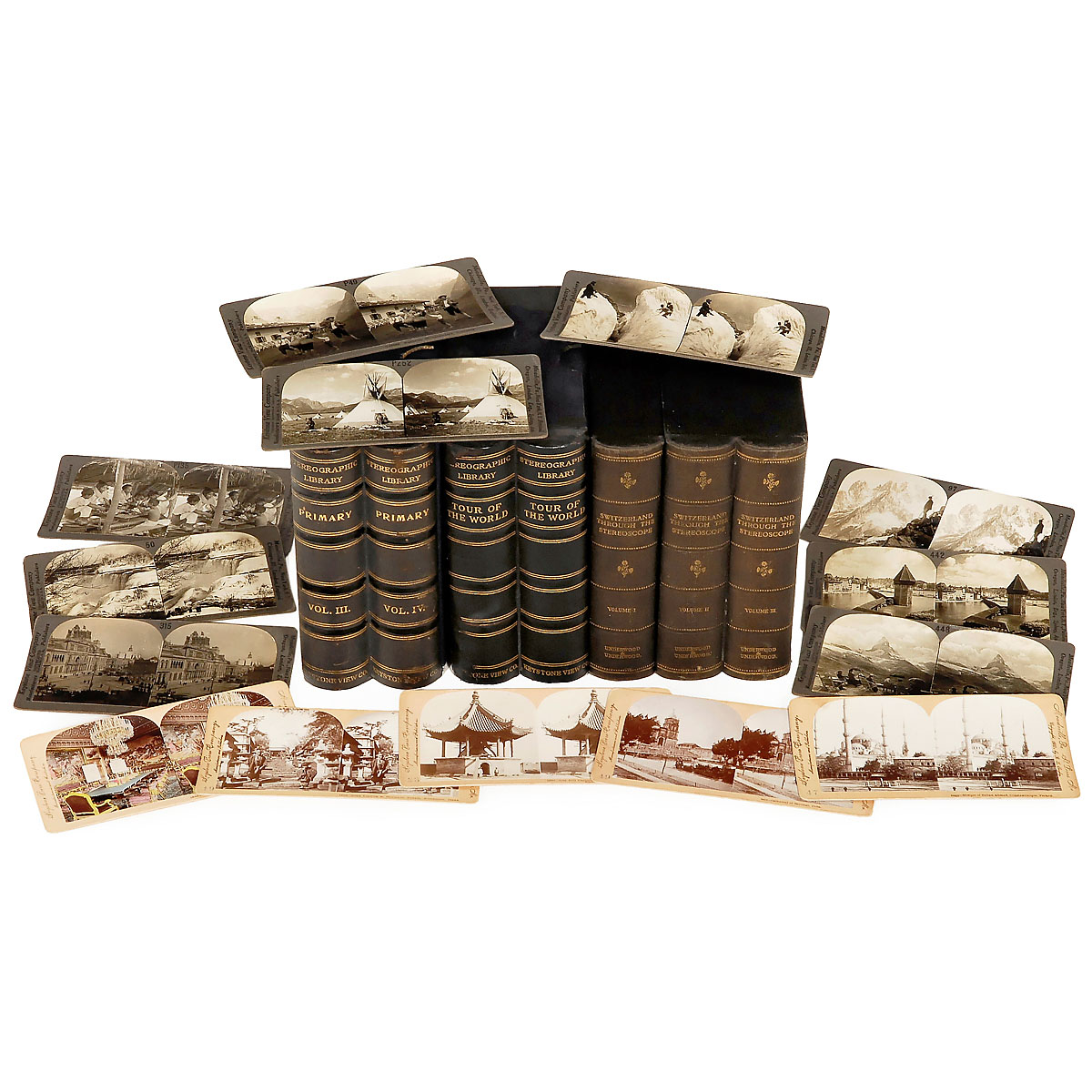 1) Keystone View Co. 2 double book cassettes with approx. 100 stereo cards: a) "Tour of the World", and b) approx. 45 various stereo cards. – And: 2) Underwood & Underwood. "Switzerland through the Stereoscope", approx. 107 stereo cards.